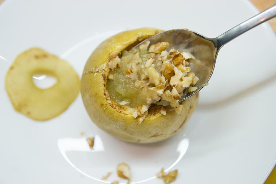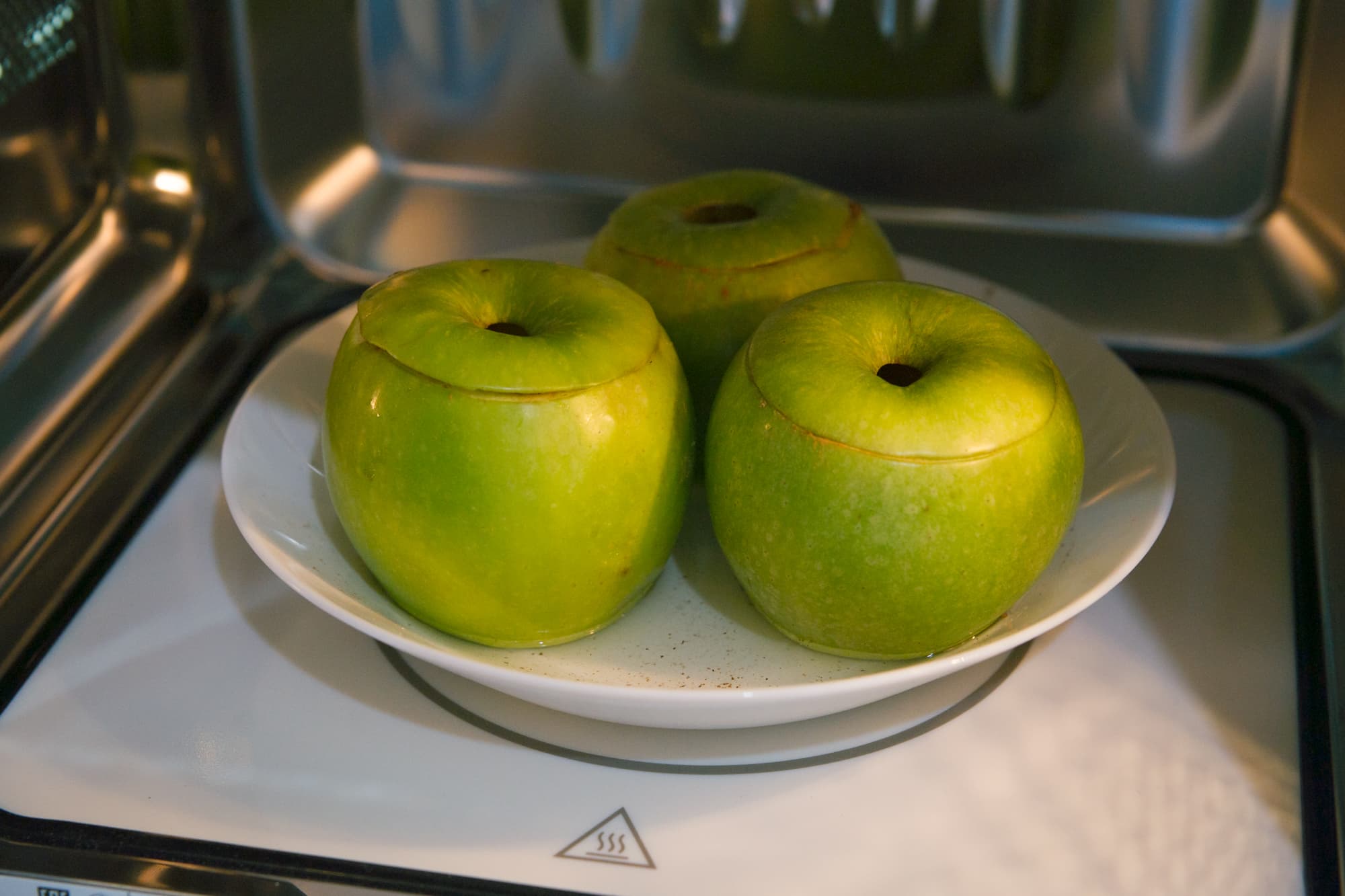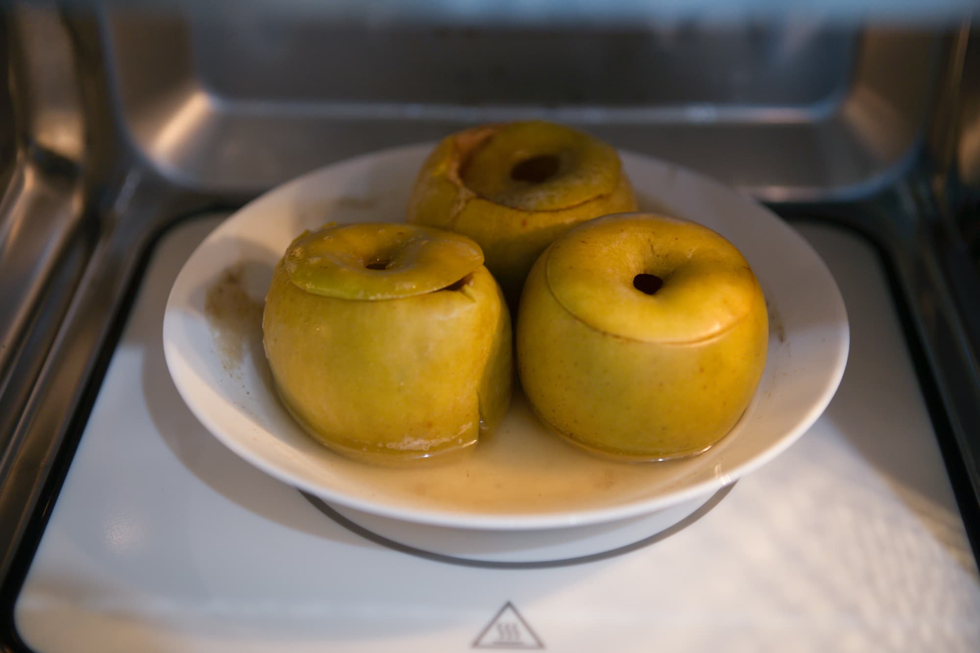 Для запекания понадобилось 8 минут на мощности 100%. К концу работы микроволновки мы обнаружили, что яблоко, находившееся справа ближе к дверце, хоть и стало мягче, но до полной готовности дойти не успело.