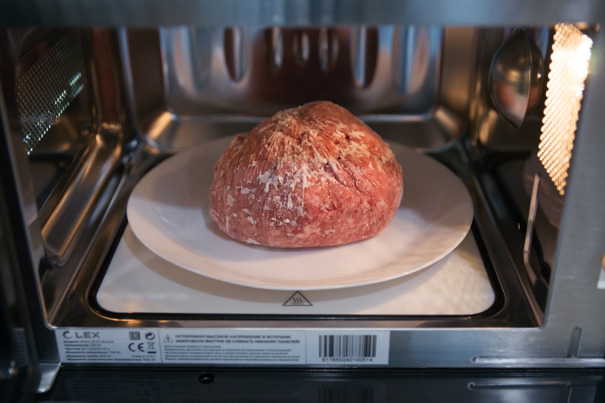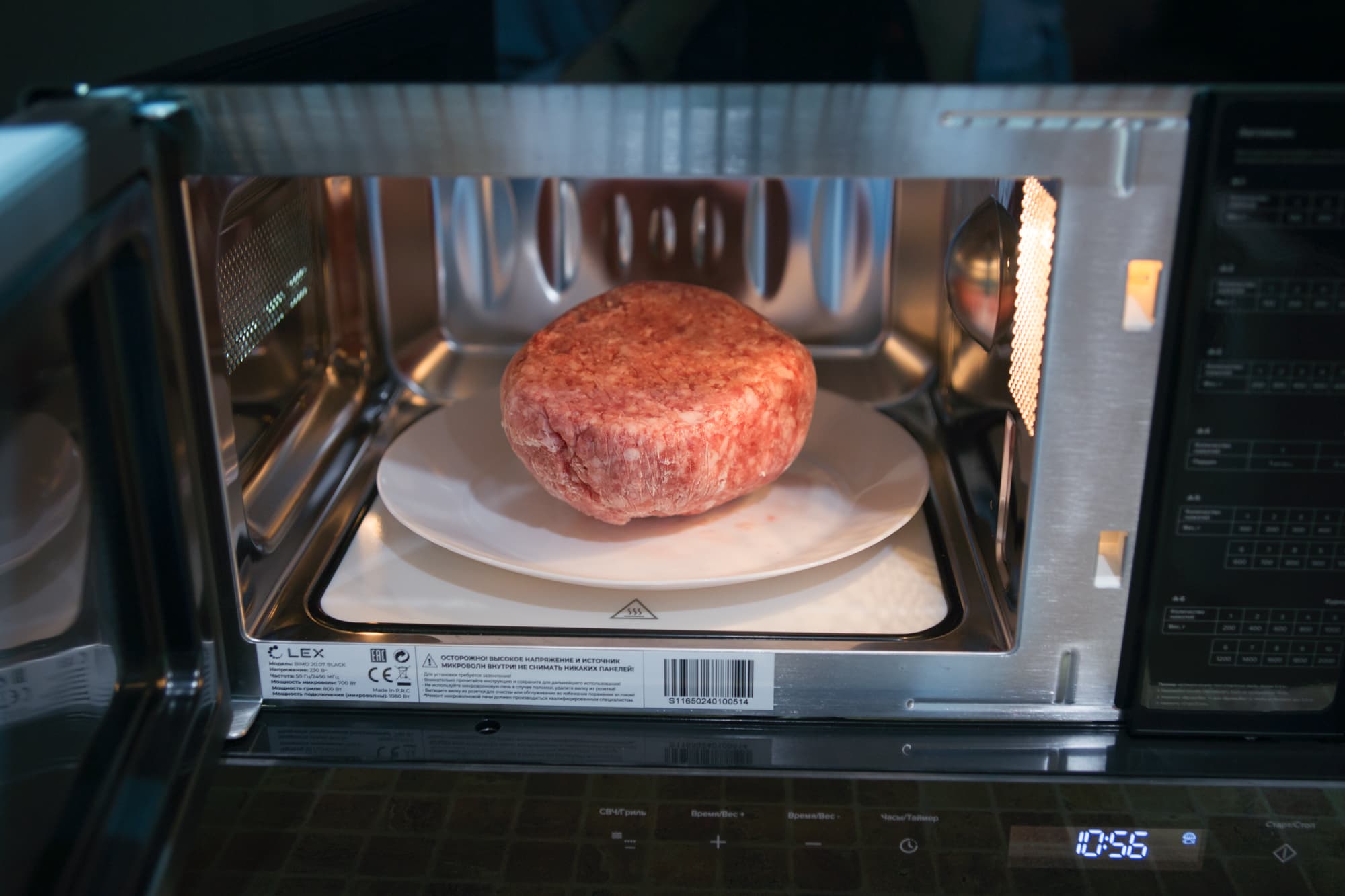 Фарш отправился в камеру микроволновки на режим авторазморозки по весу. Устройство решило, что на этот вес ему хватит 15,5 минут. В инструкции предупреждают, что спецсигнала в процессе разморозки не предусмотрено, поэтому пользователю нужно самостоятельно решить, когда и сколько раз перевернуть кусок. Мы решили, что одного раза будет достаточно.