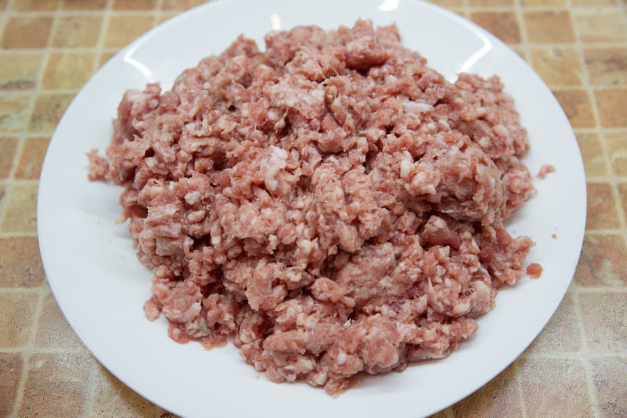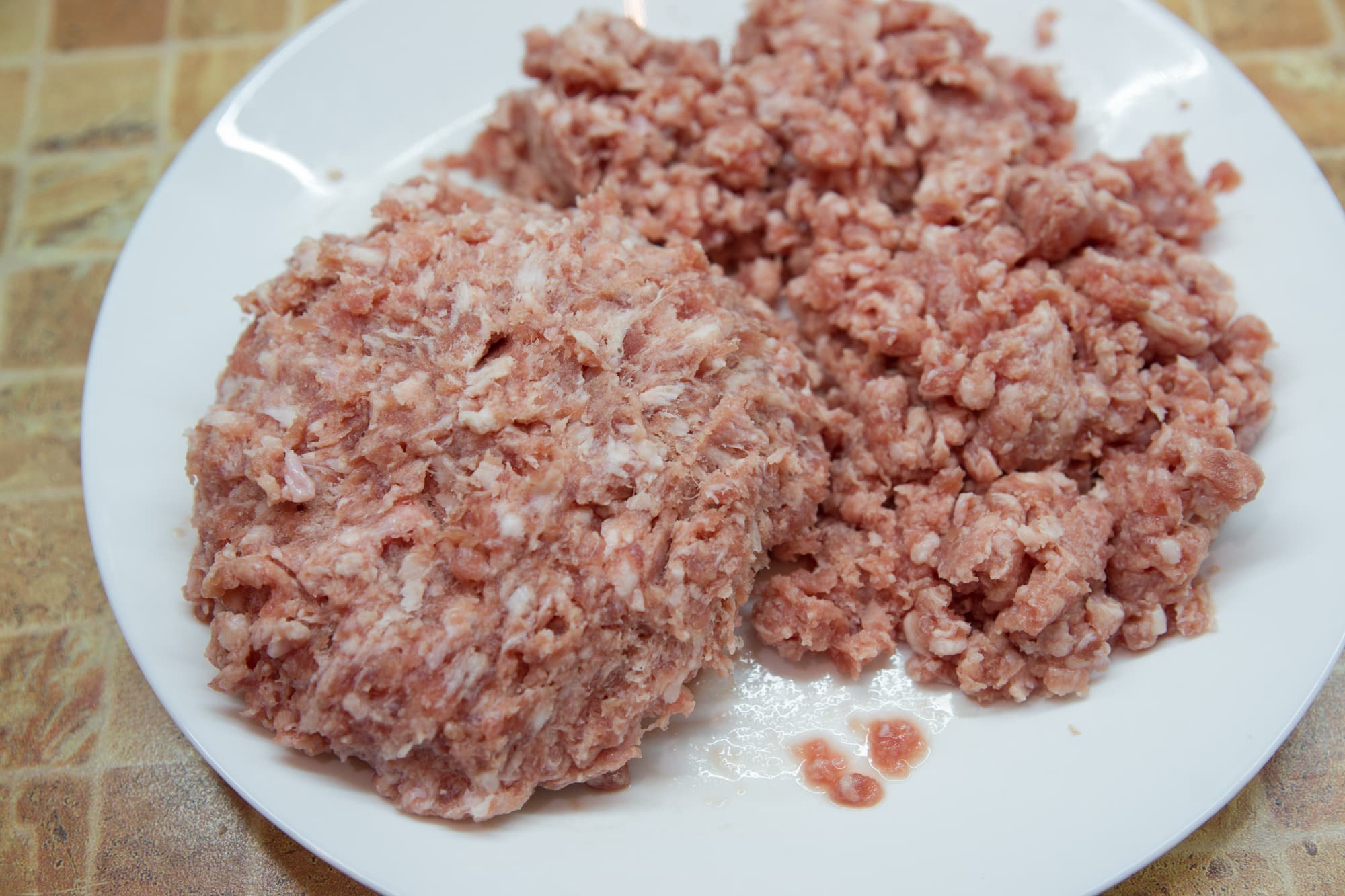 Для первого традиционного теста мы взяли 800 г свино-говяжьего фарша, слепили из него шар и на сутки заморозили.