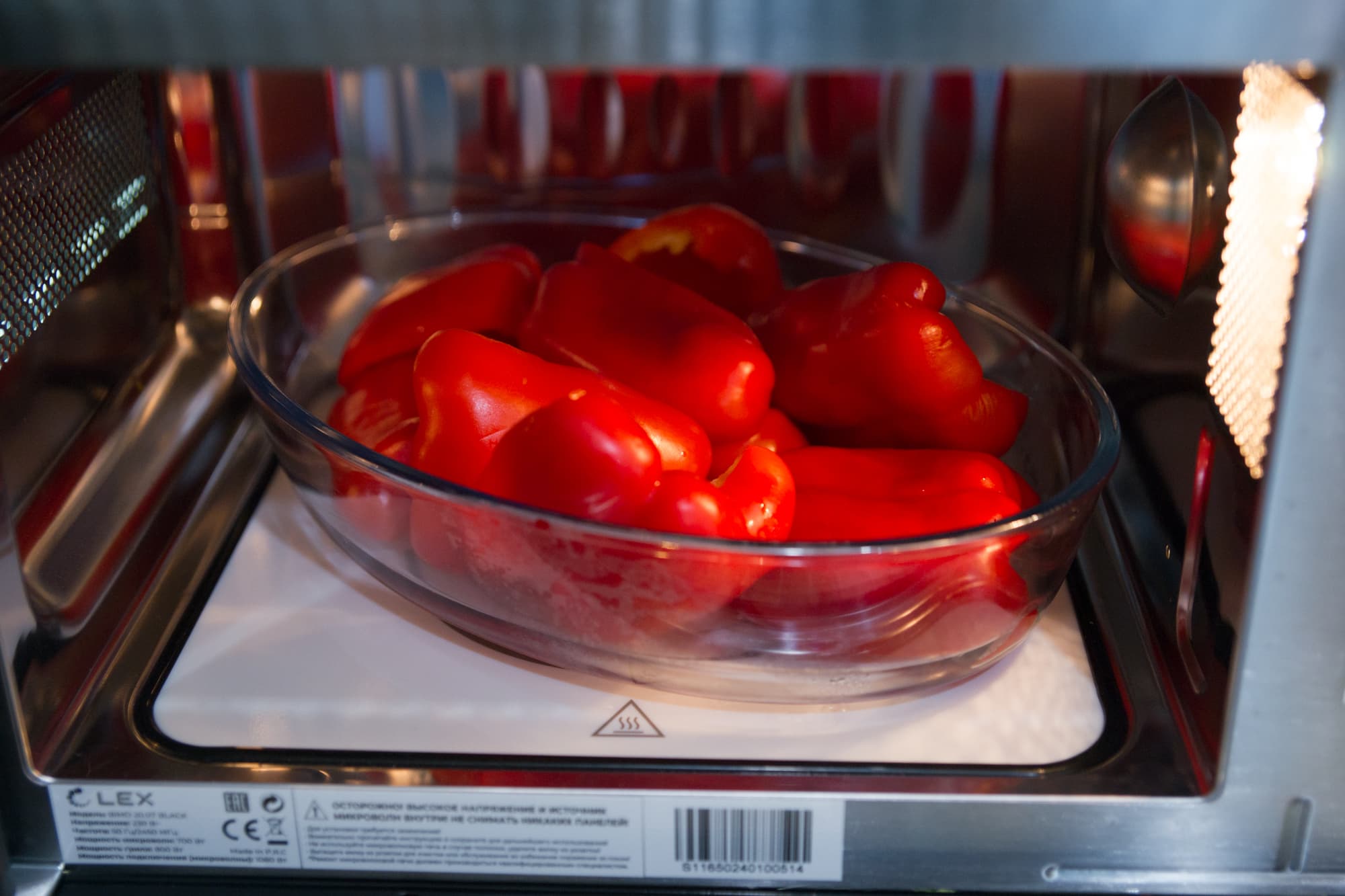 Мы были правы, перцы за это время едва размягчились, так что мы добавили сначала 10 минут на максимальной мощности микроволн, а потом еще 5. Запекание происходило под крышкой. Мы уже знали о неравномерности нагрева, поэтому в процессе дважды разворачивали емкость.