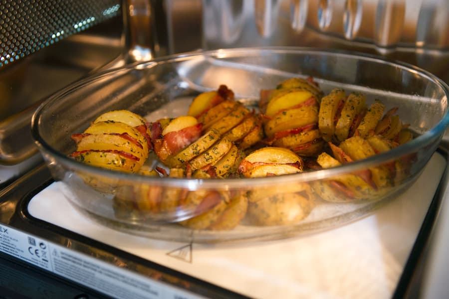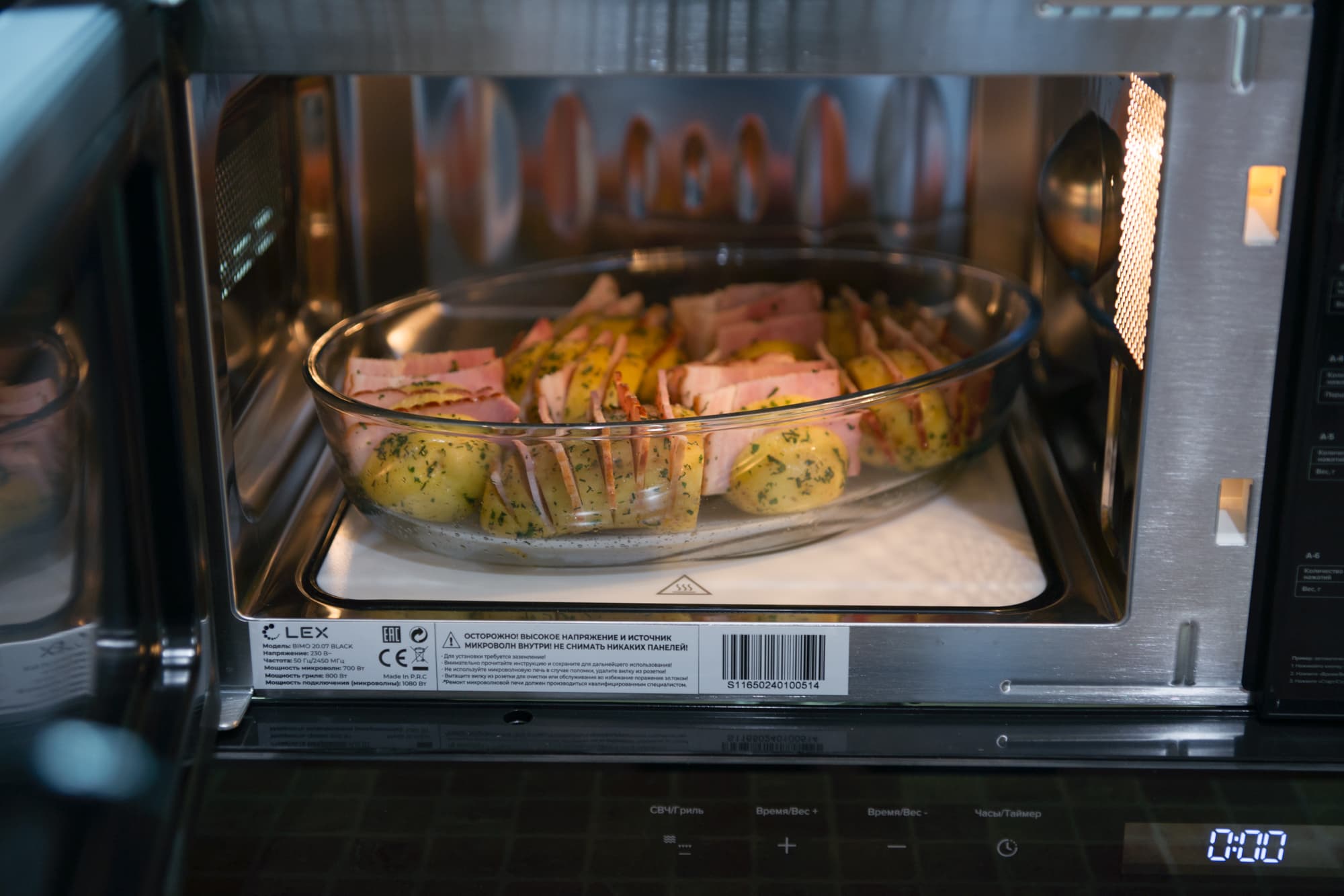 Мы начали с микроволн. Сначала запекали картофель под крышкой в течение 30 минут, в процессе не забывая пару раз поменять положение блюда.