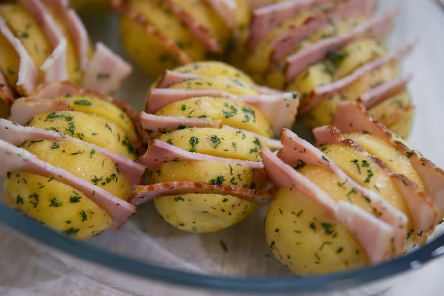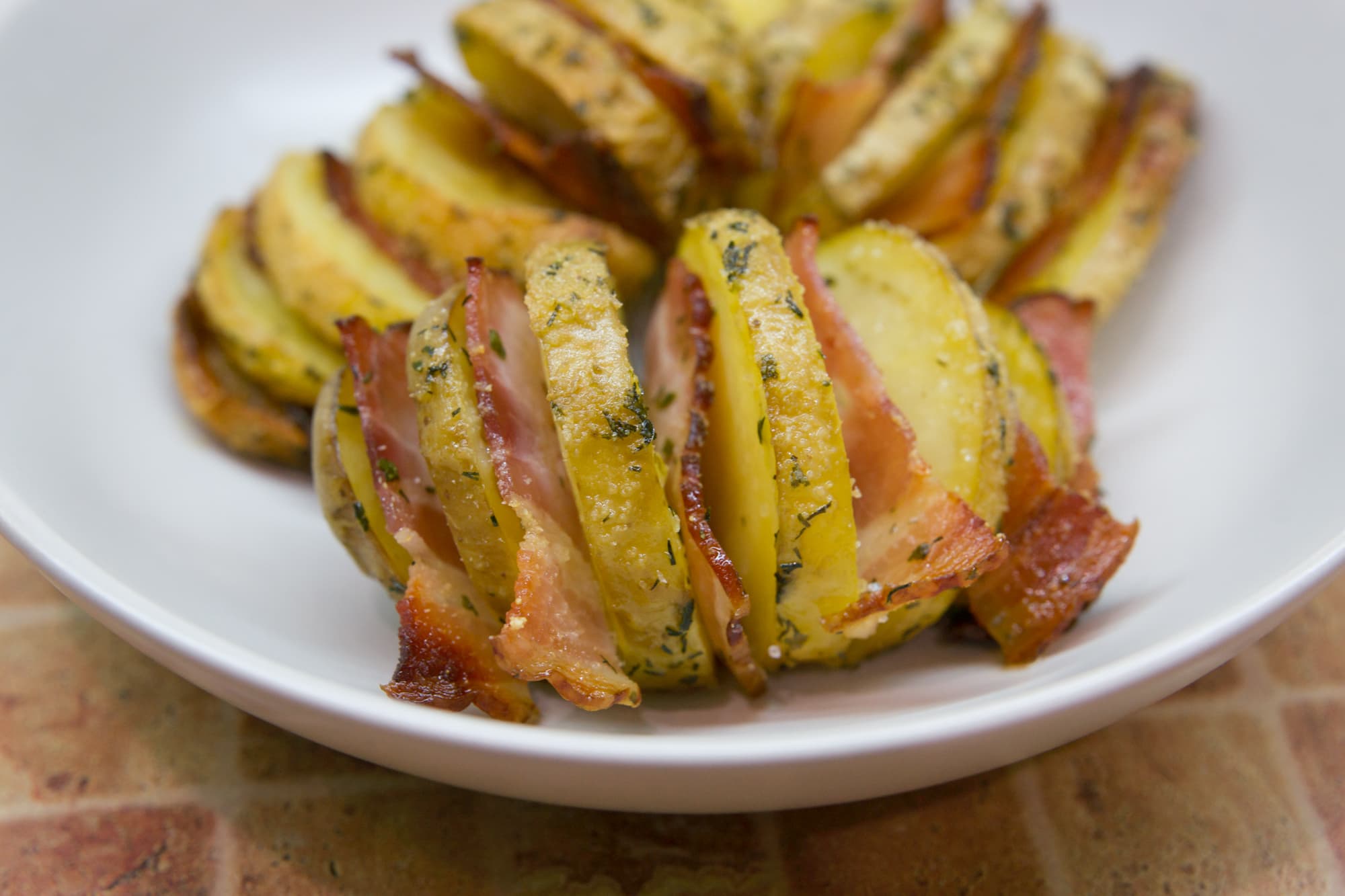 Картофель помыли, почистили, надрезали, сбрызнули растительным маслом, обваляли в сухой измельченной зелени и соли. Кусочки грудинки, разместили в надрезах, обсыпали картошку сухим чесноком и отправили в микроволновку.