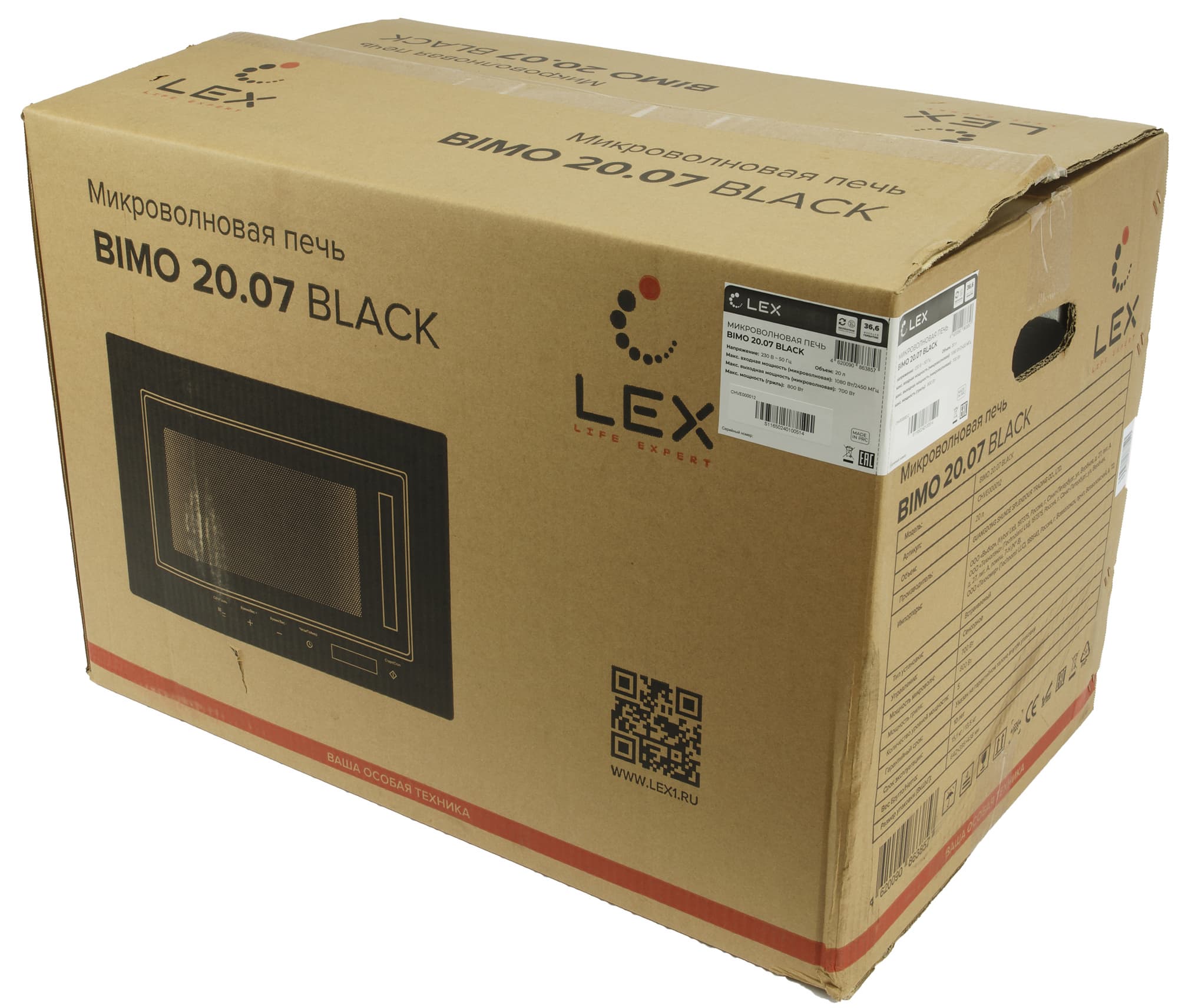 Микроволновая печь Lex Bimo 20.07 BL поставляется в большой коробке из прочного коричневого картона.