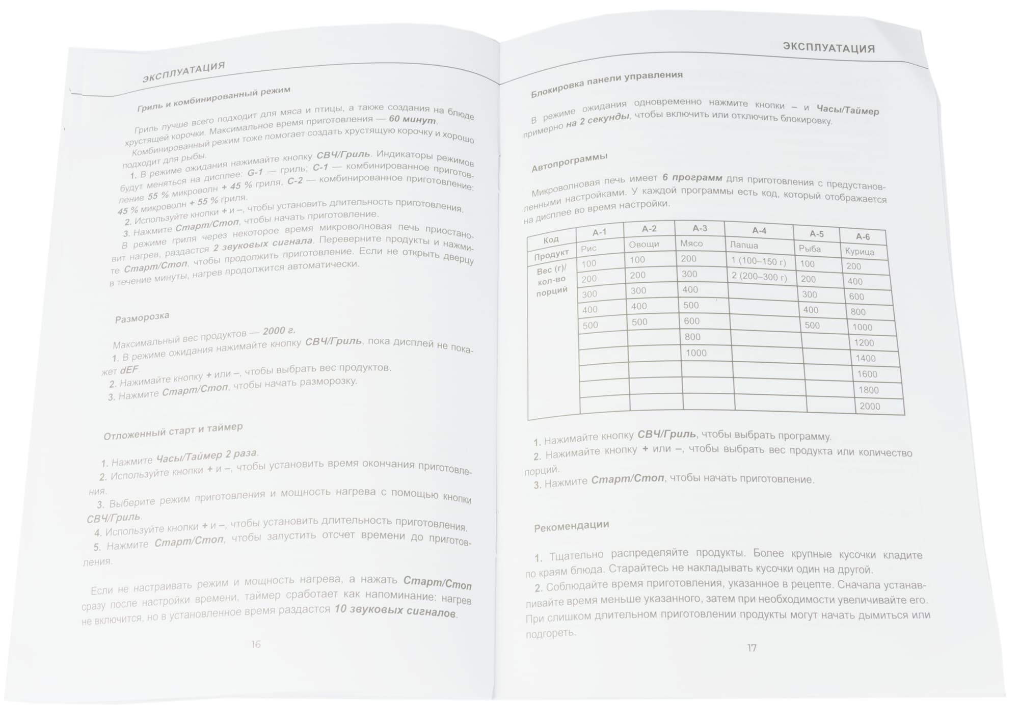 | Режимы работы | микроволны, гриль, комбинированные режимы (микроволны+гриль), экспресс-программа, разморозка по весу и по времени, автопрограммы |