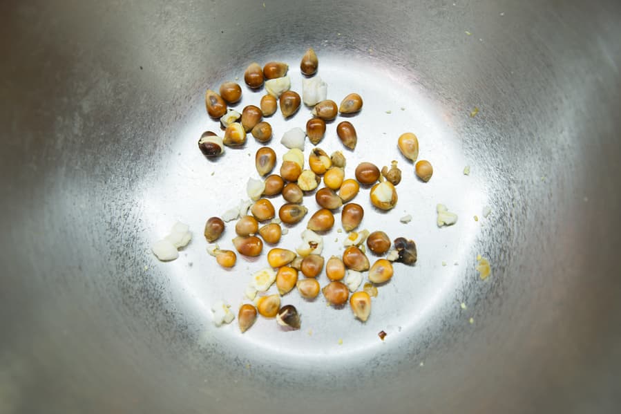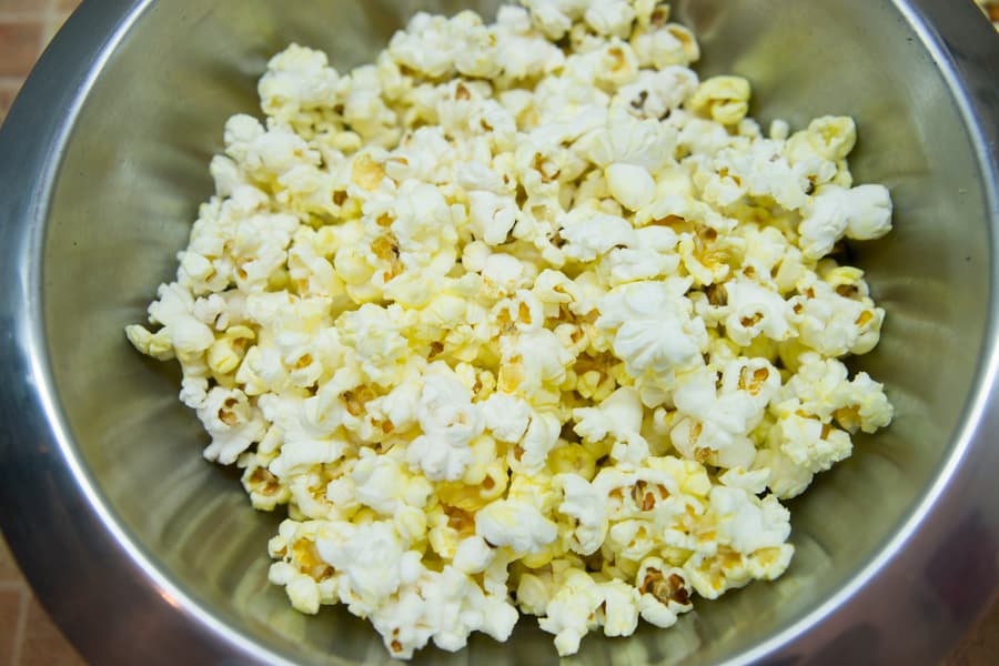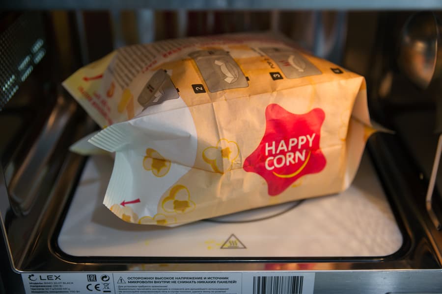 Поместили пакет строго по центру керамической панели, включили 100% мощности микроволн на 3 минуты и приготовились прислушиваться. Примерно через 1,5 минуты стали раздаваться характерные хлопки. К концу третьей минуты они не прекратились и пауза между ними не увеличилась, так что мы смело добавили минуту, а потом еще 30 секунд. Хлопки еще были слышны, но мы побоялись сжечь попкорн и решили остановиться на этом.