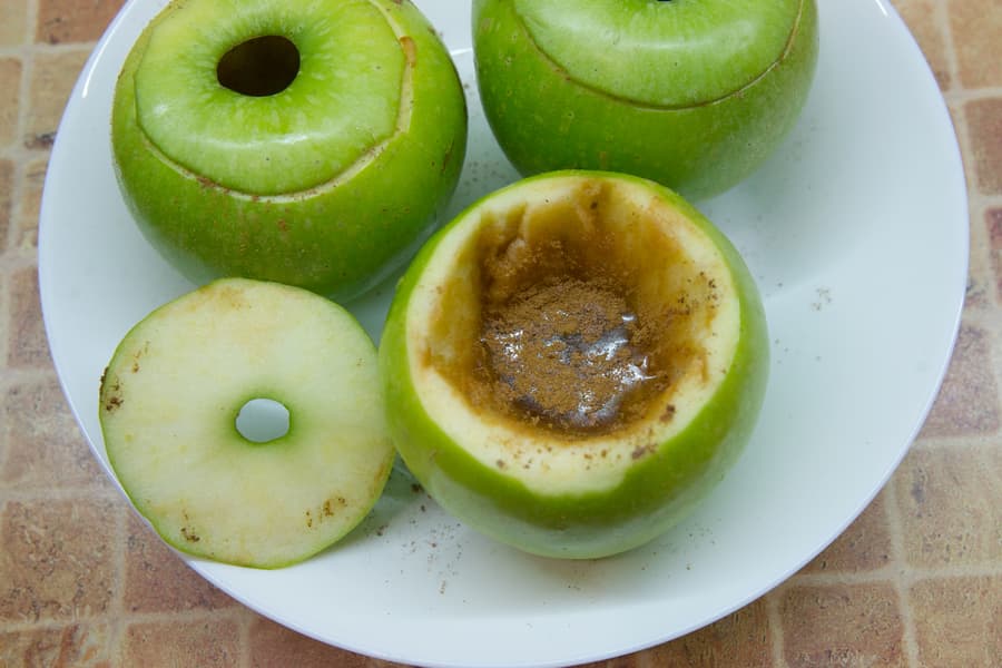 С трех яблок среднего размера срезали верхушки и удалили сердцевины с косточками. В получившиеся лунки добавили по чайной ложке меда и по щепотке корицы.
