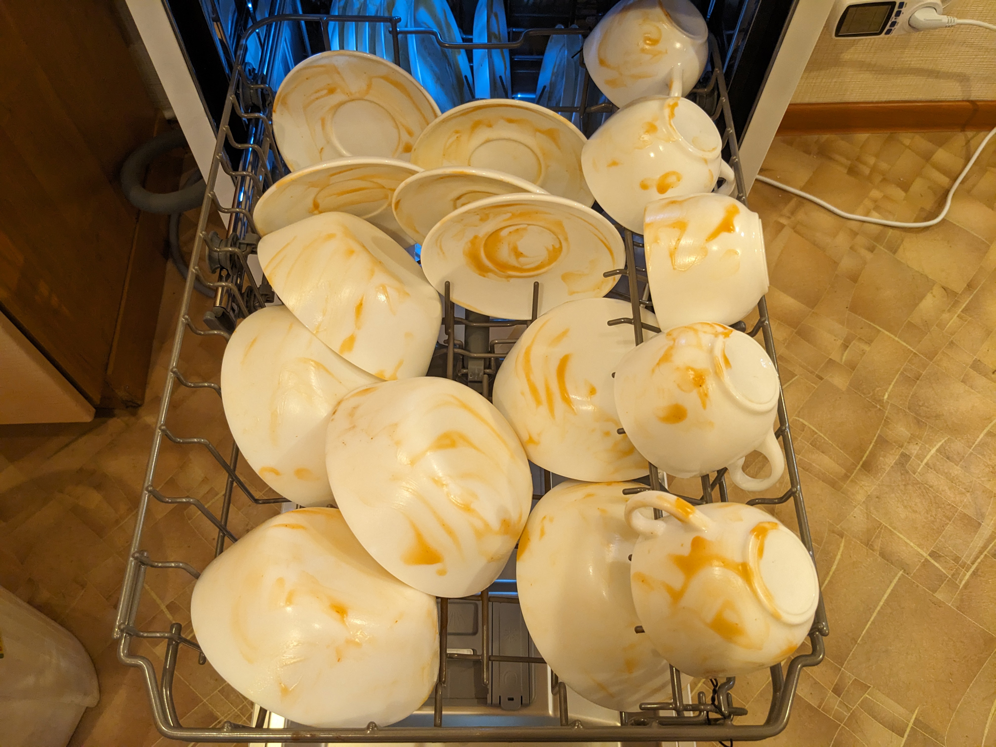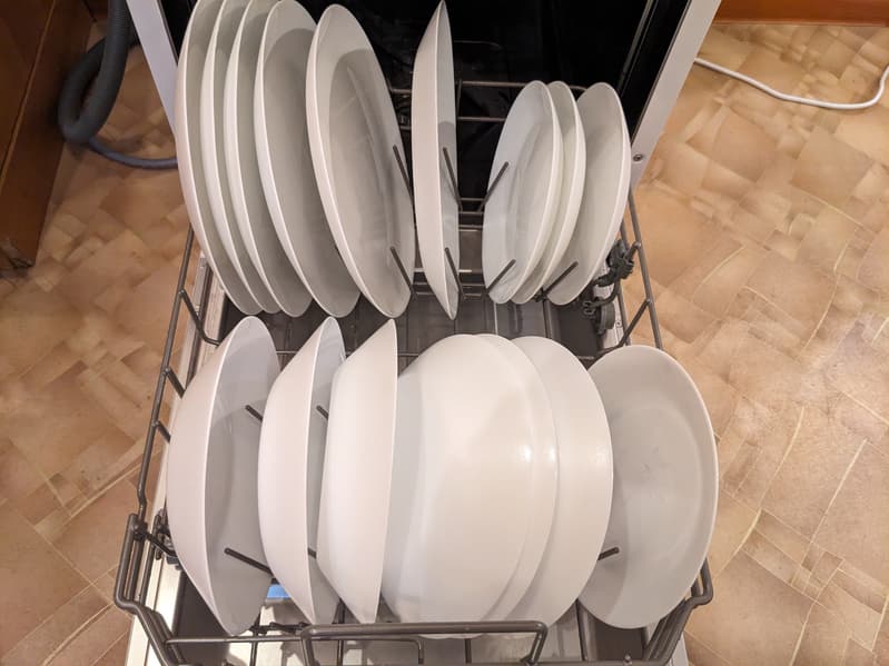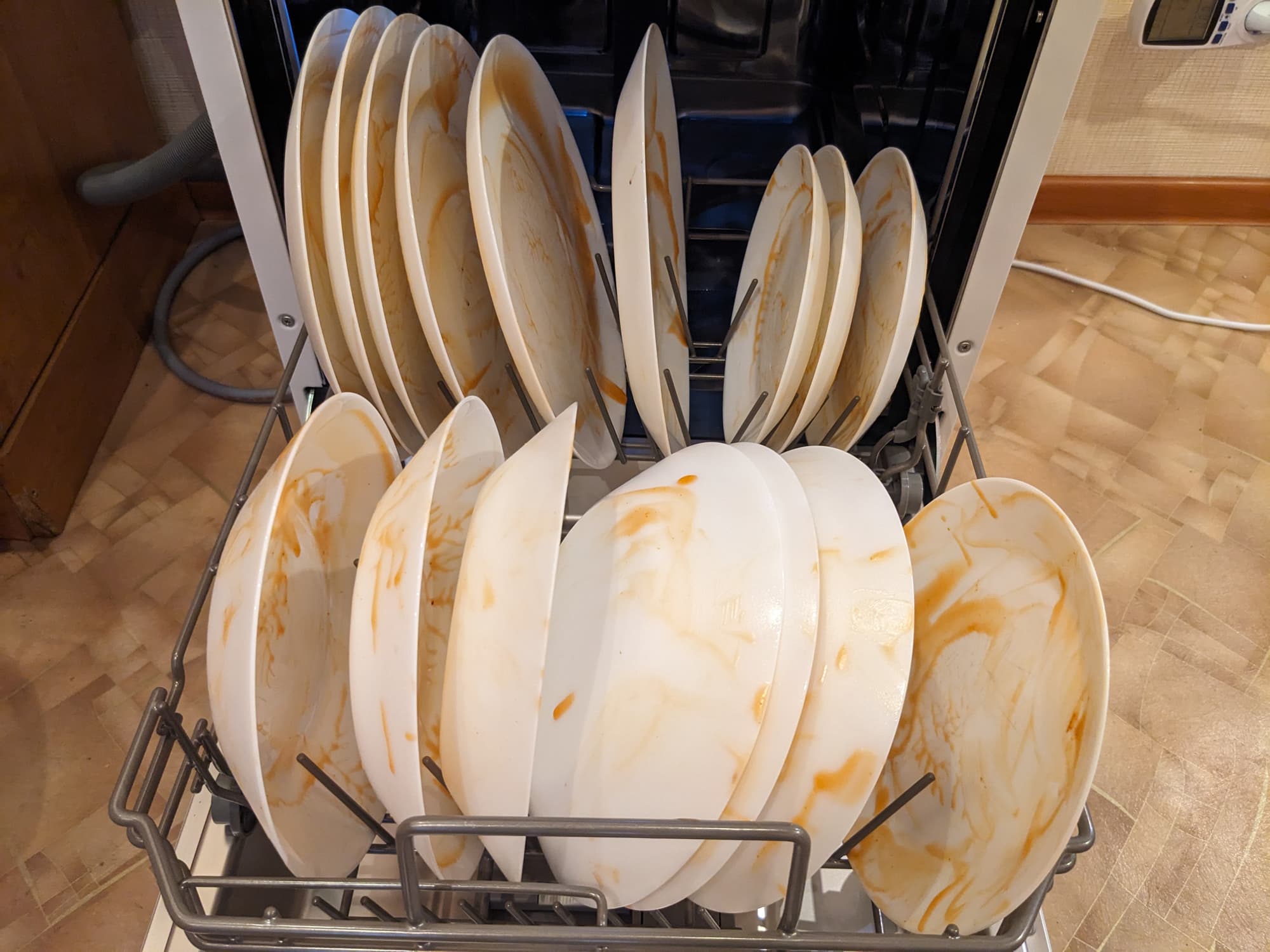 Запачканные смесью майонеза и кетчупа тарелки мы выдержали в течение суток, чтобы смесь полностью высохла, и нарочито небрежно расставили в нижней корзине.