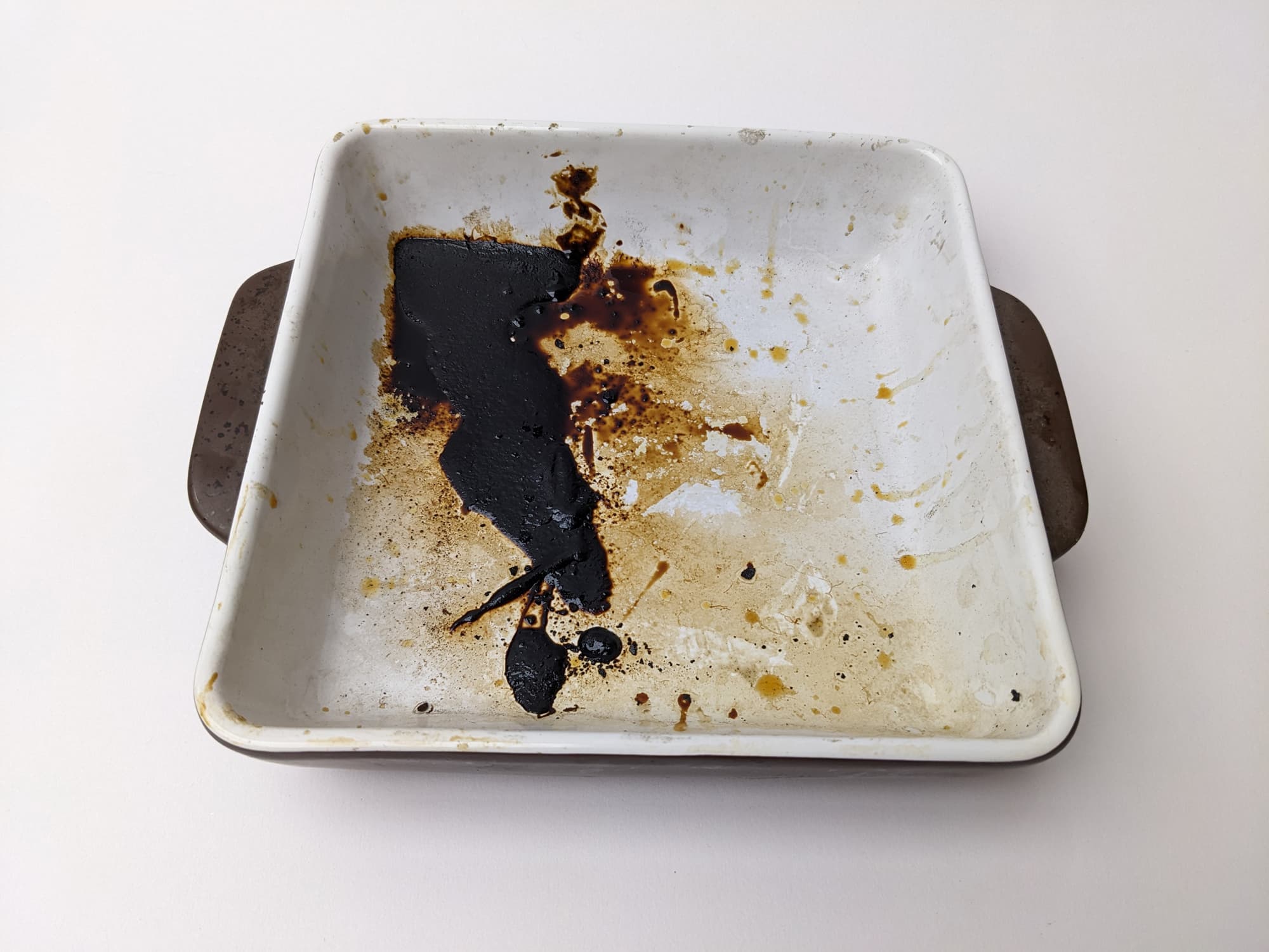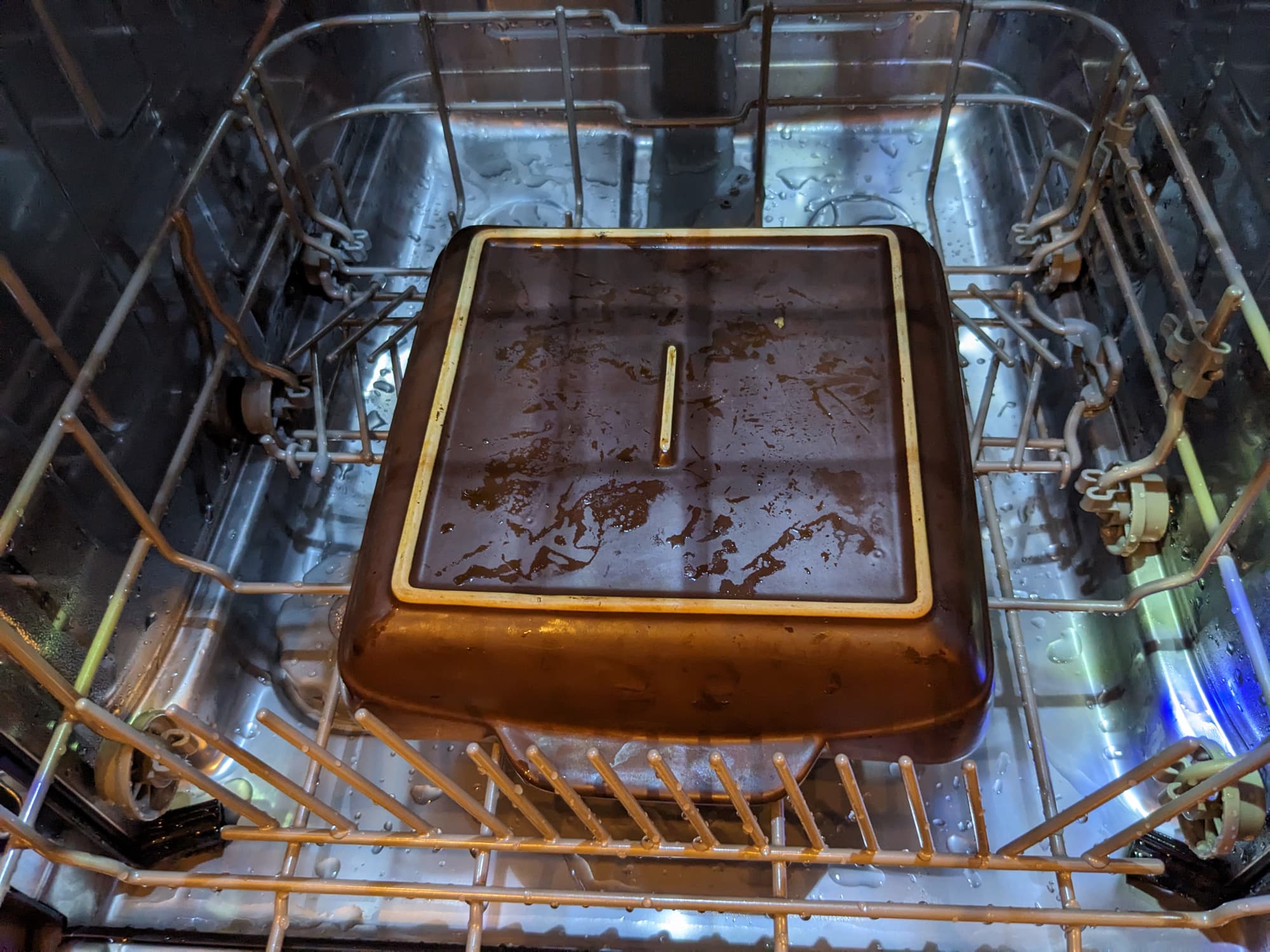 Для того чтобы проверить, как посудомоечная машина справится с сильными загрязнениями, мы воспользовались керамической формой, в которой запекалось мясо в фольге. Пригоревшие сок с жиром образовали прочную корку, которую сложно отмыть вручную.