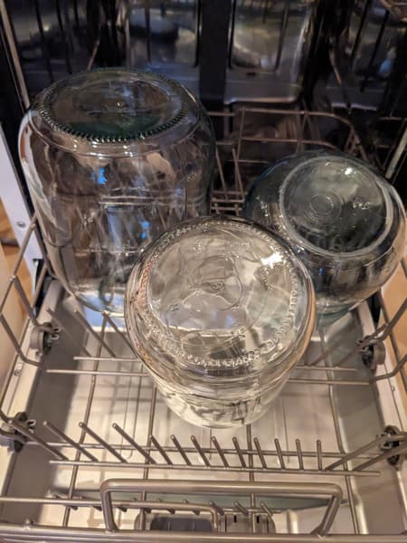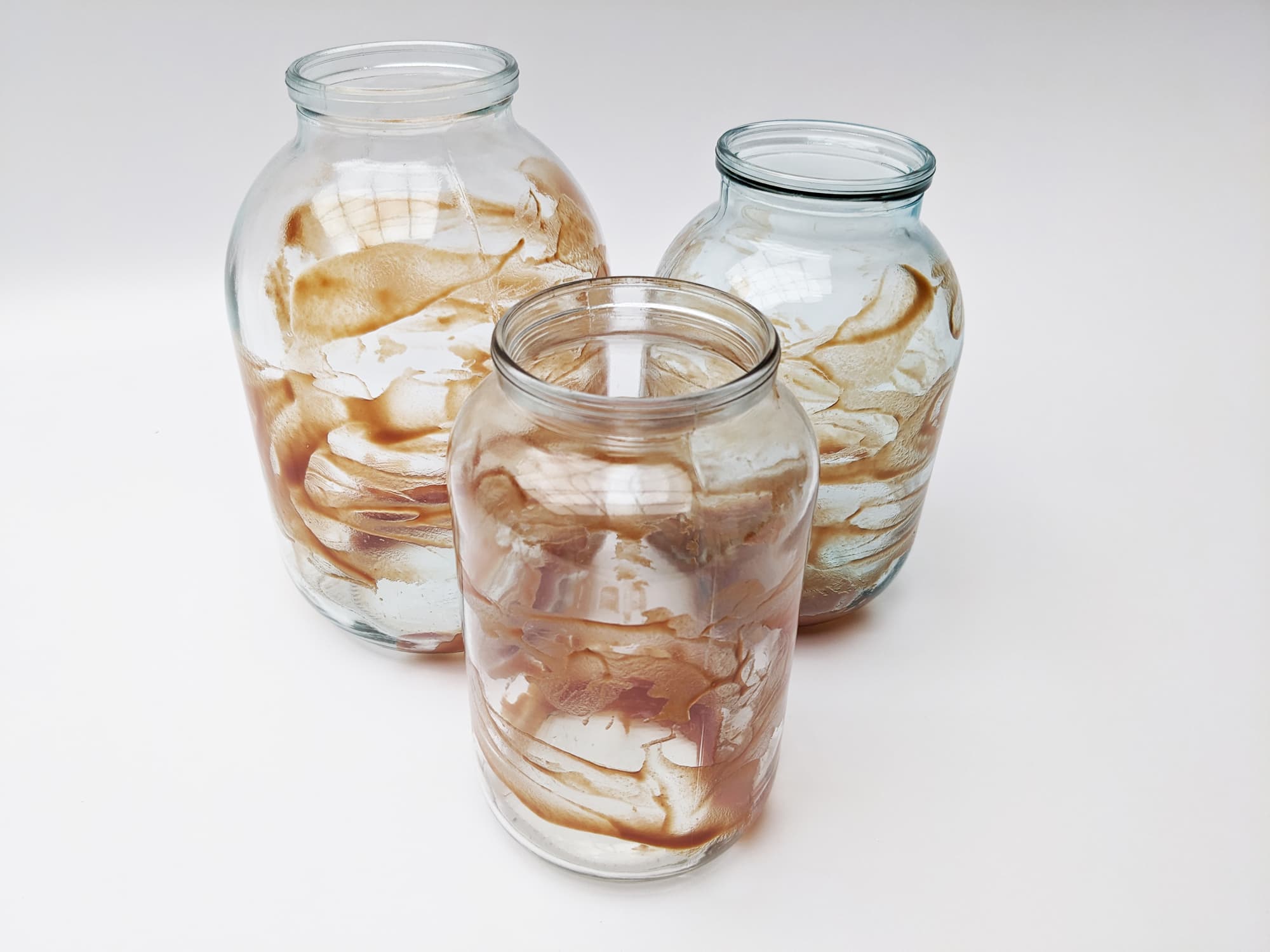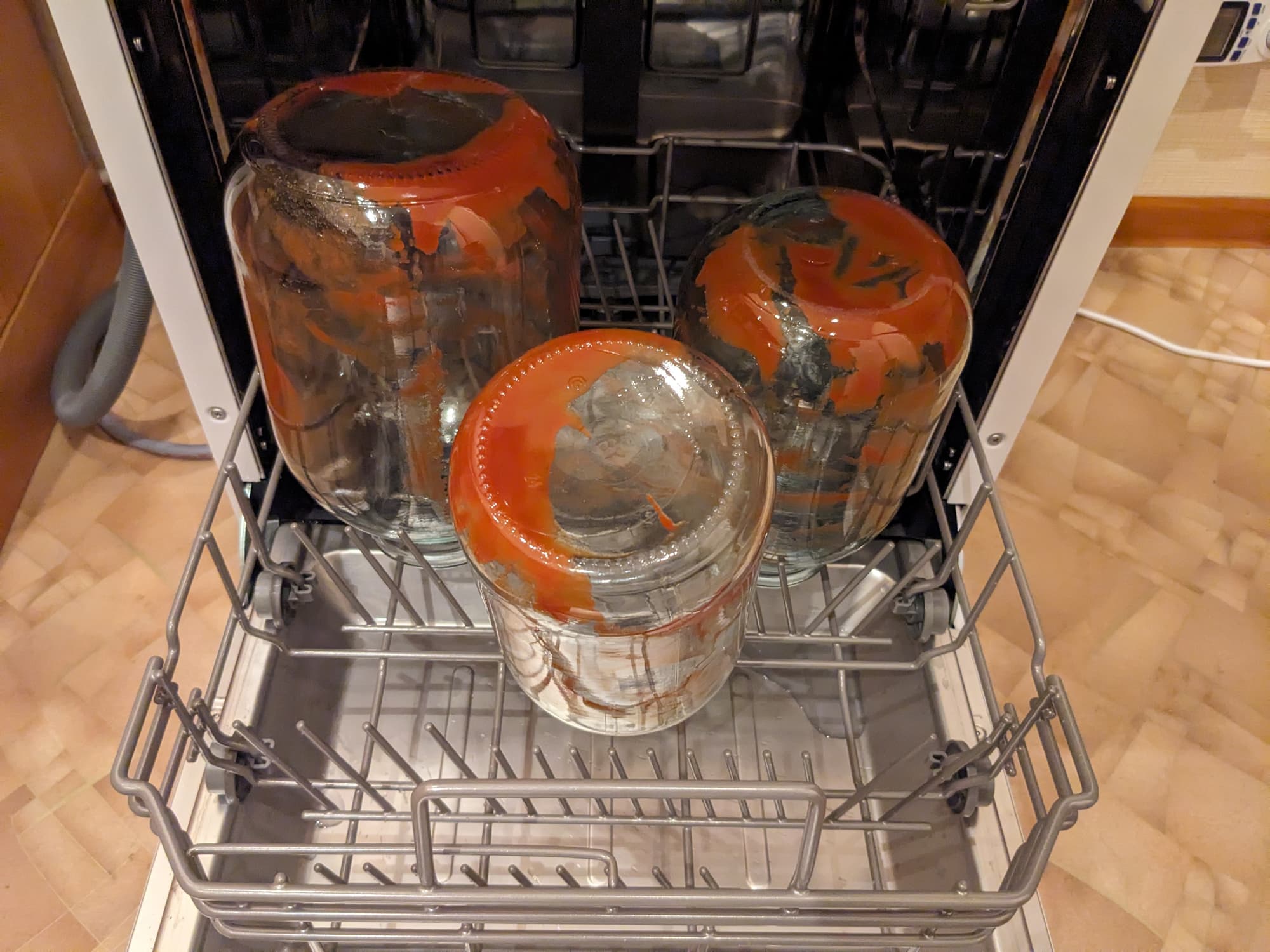 Для тестирования автоматической программы мы взяли три банки — трехлитровую и две двухлитровые. Обильно запачкали их изнутри кетчупом (на этот раз без майонеза) и дали высохнуть в течение суток.