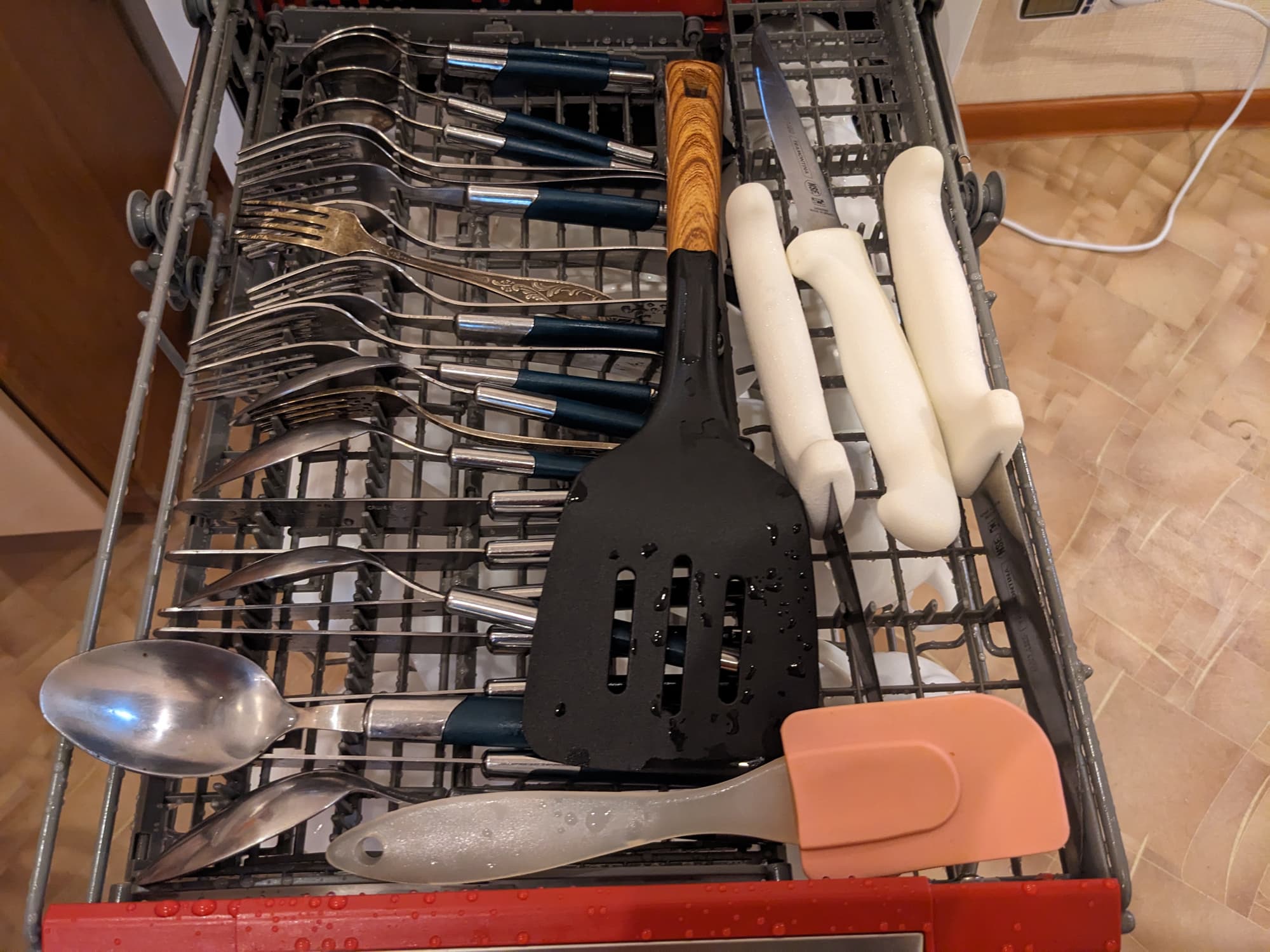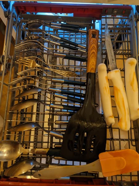 В верхнюю корзину мы уложили столовые приборы и кухонные принадлежности, не слишком заботясь о правильности размещения.