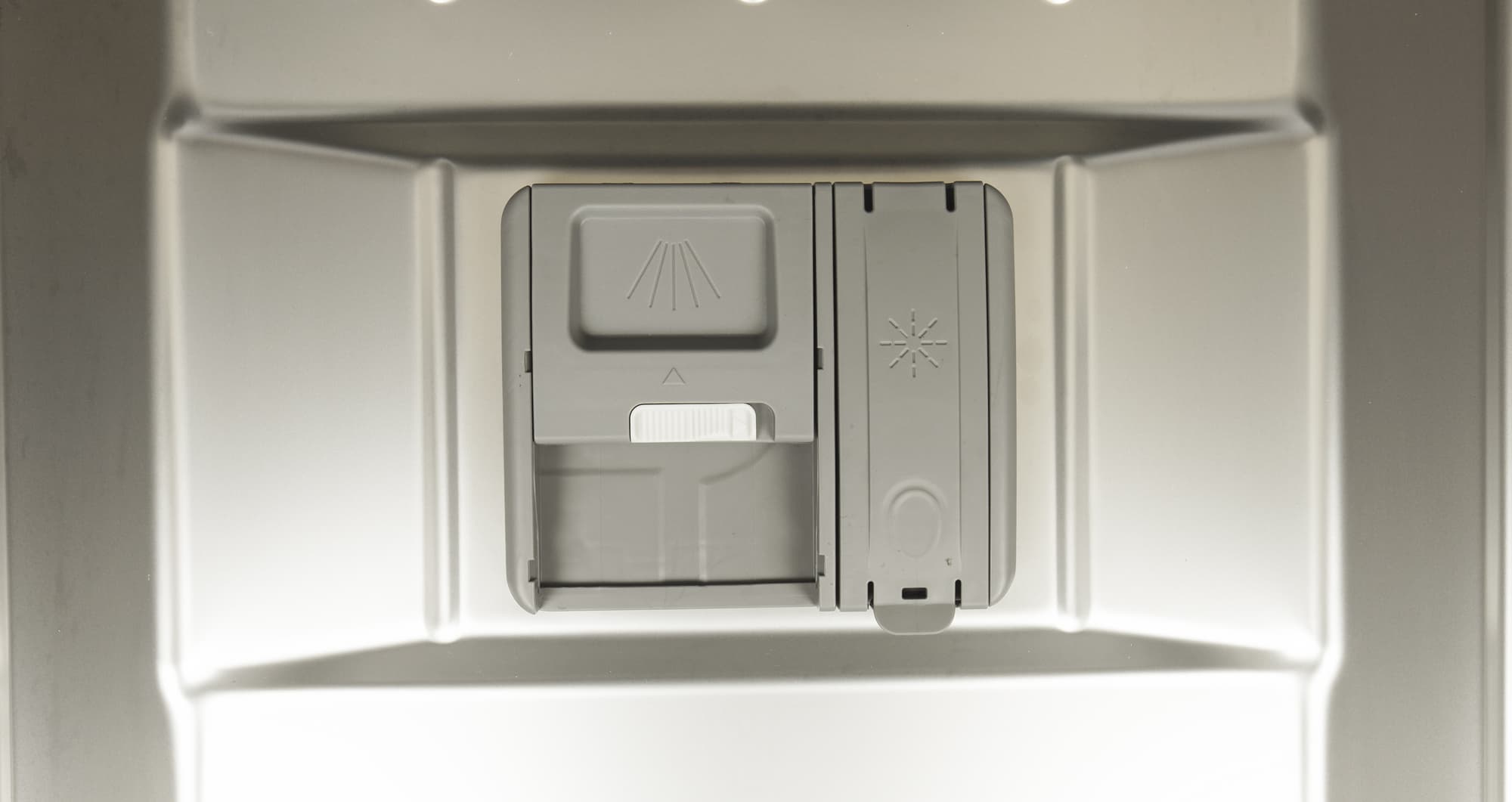 Конструкция блока тоже вполне стандартная: слева под сдвижной крышкой находится квадратный отсек для порошка или таблетированных средств, а за откидной задвижкой скрывается резервуар для ополаскивателя.
