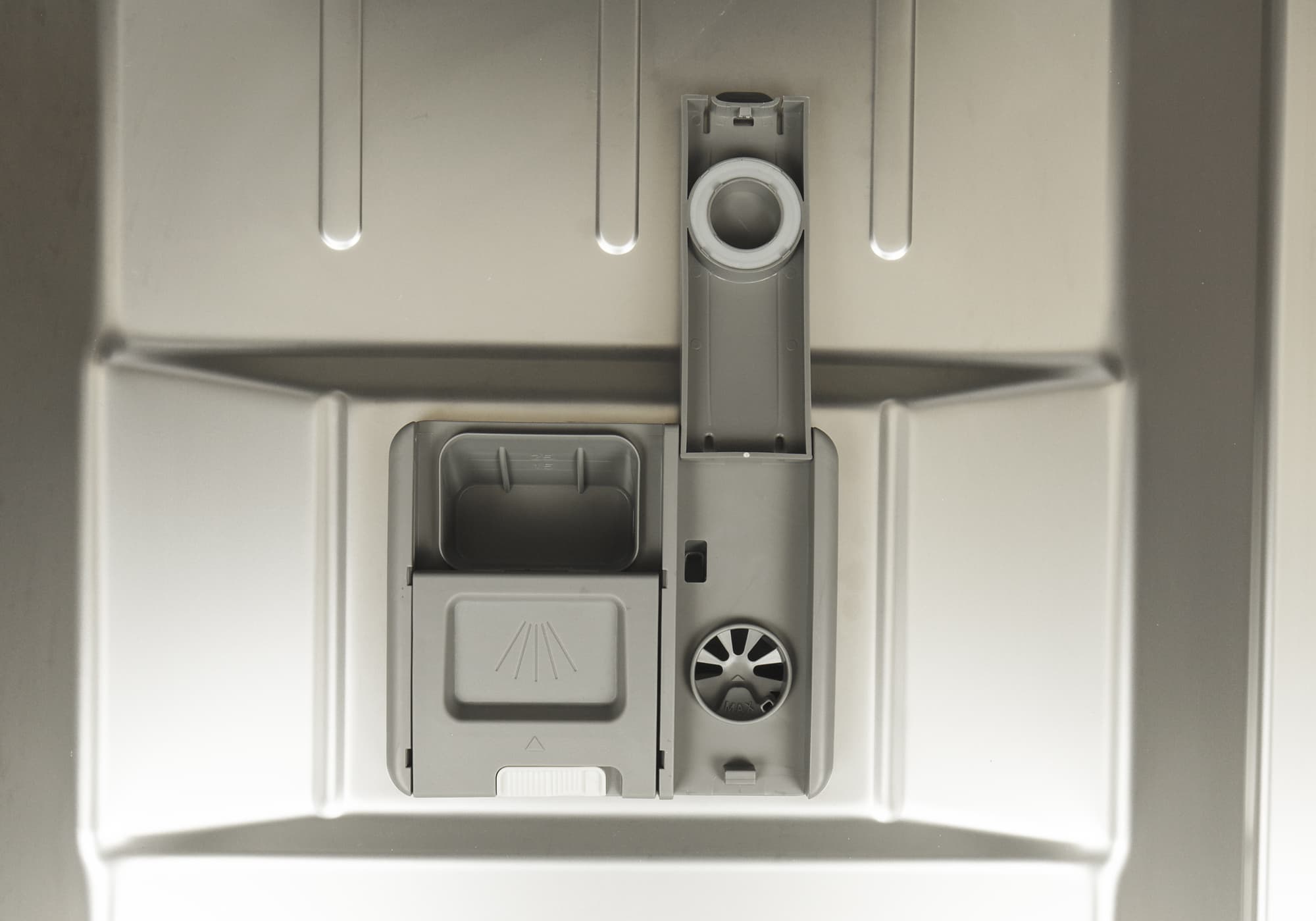Расположенный на дверце отсек для моющих средств сделан из обычного серого пластика.