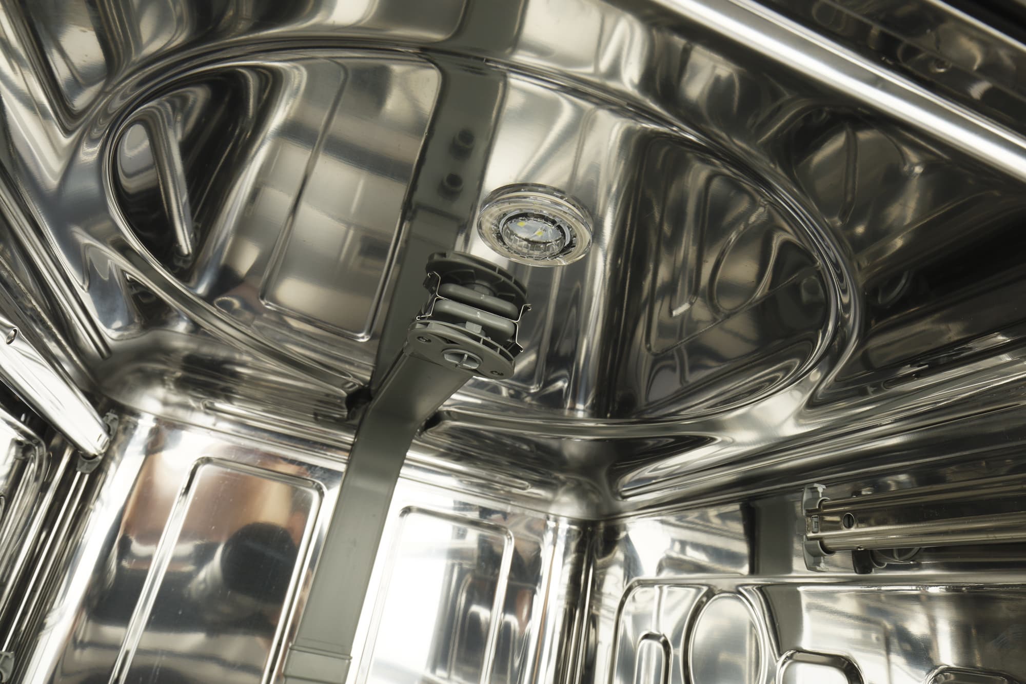 На потолке бака вращается форсунка, предназначенная для мытья столовых приборов на верхней полке. Рядом с ней — круглый плафон подсветки с четырьмя яркими светодиодами холодного спектра.