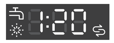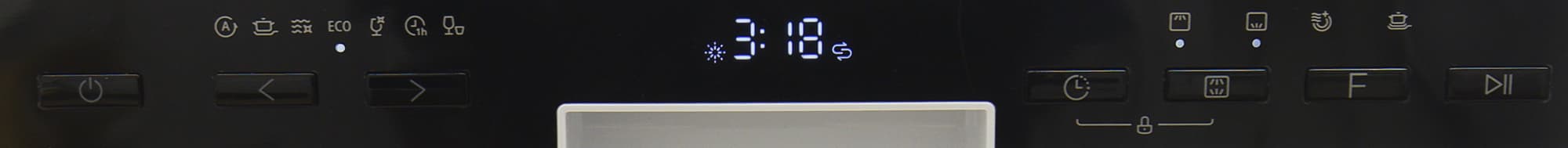 На светодиодном дисплее отображается прогнозируемое или оставшееся время мытья посуды, а при возникновении неисправности — код ошибки. Справа и слева от цифр расположены индикаторы отсутствия воды, ополаскивателя и соли.