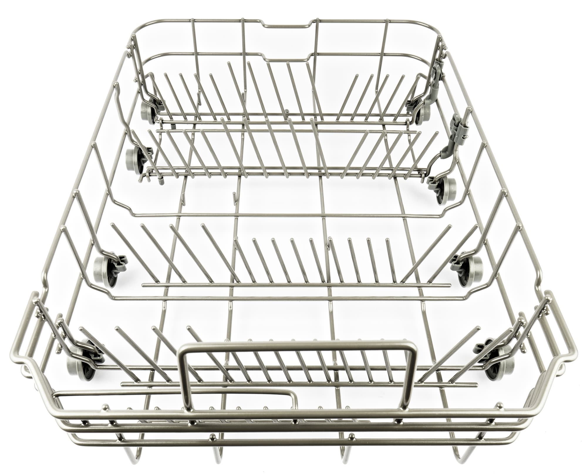 Средняя корзина, предназначенная для небольшой посуды, снабжена неподвижными держателями для блюдец в средней части и откидной металлической полкой для чашек на правом боку.