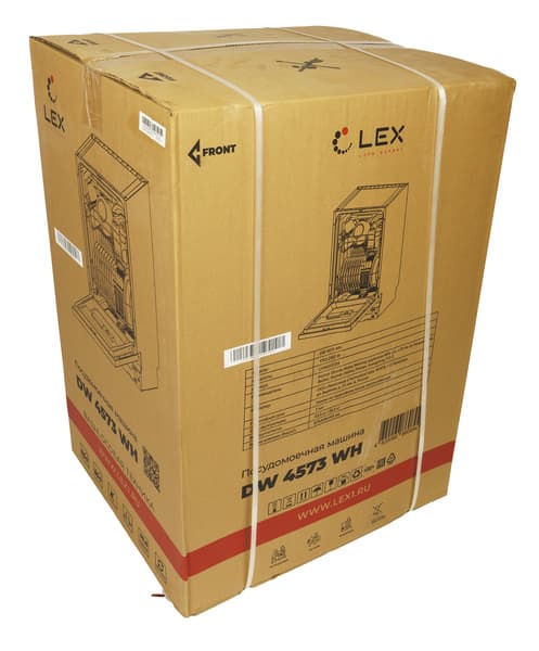 На упаковке из коричневого картона и пенопласта, усиленной капроновыми стропами, довольно много информации о посудомоечной машине, находящейся внутри. Переднюю сторону украшает ее векторное изображение в открытом виде, чуть ниже можно видеть индекс модели и QR-код, ведущий на страницу продукта на сайте производителя.