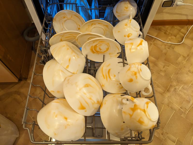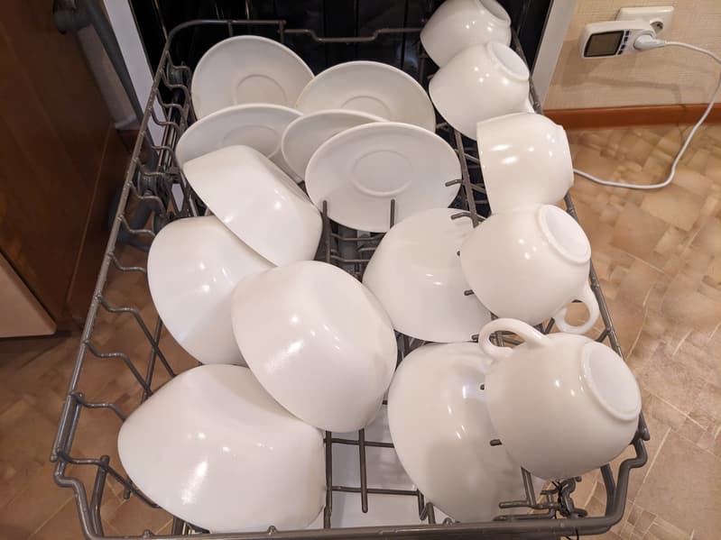 Для этого эксперимента мы выбрали автоматическую (P1) программу. Напомним, что она предназначена для слабо- или среднезагрязненной посуды и посуды с присохшей пищей — как раз наш случай.