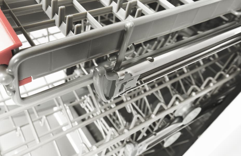 Ролики полки для столовых приборов опираются на выдвижные металлические ограничители — почти такие же, как и у средней корзины.