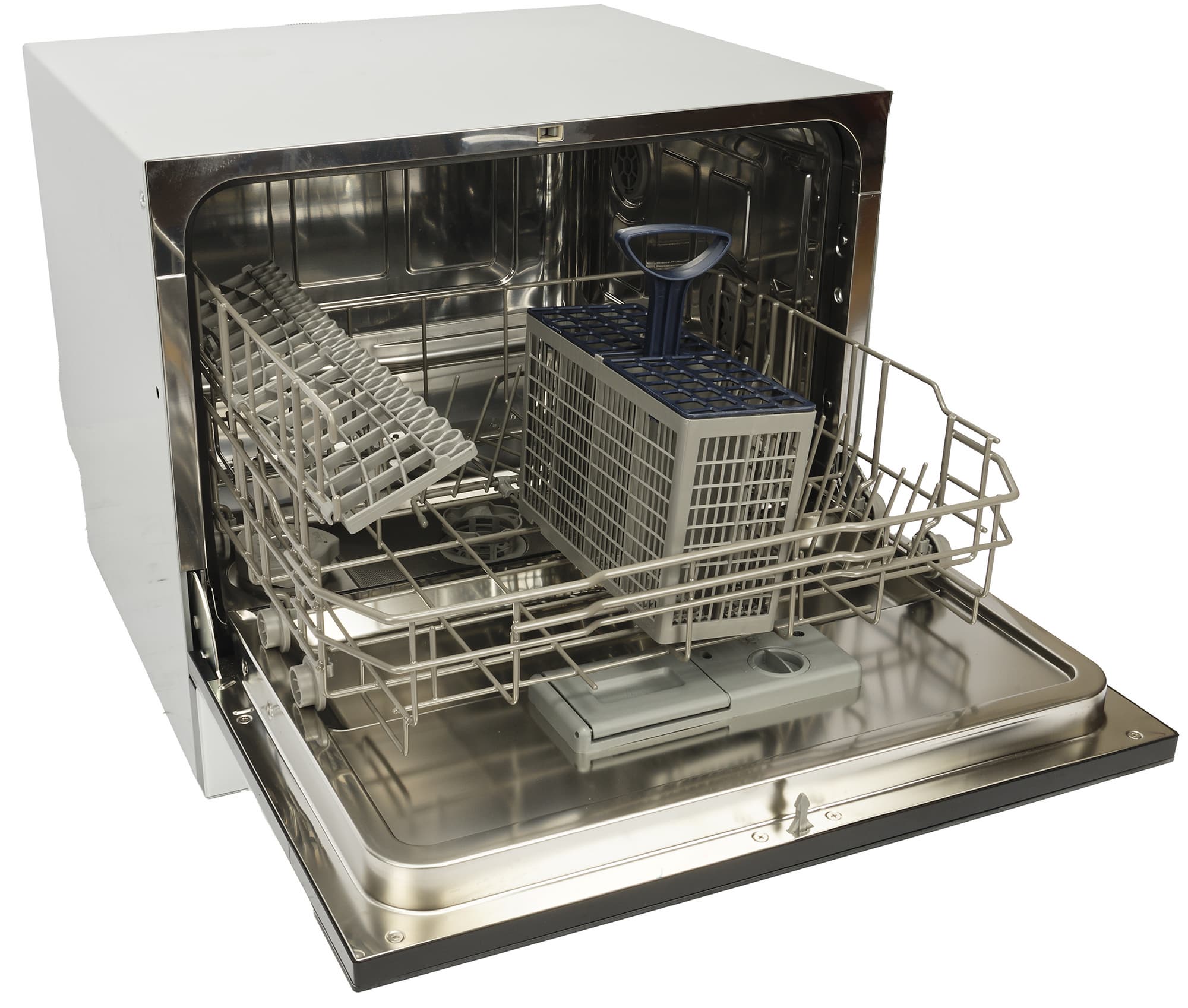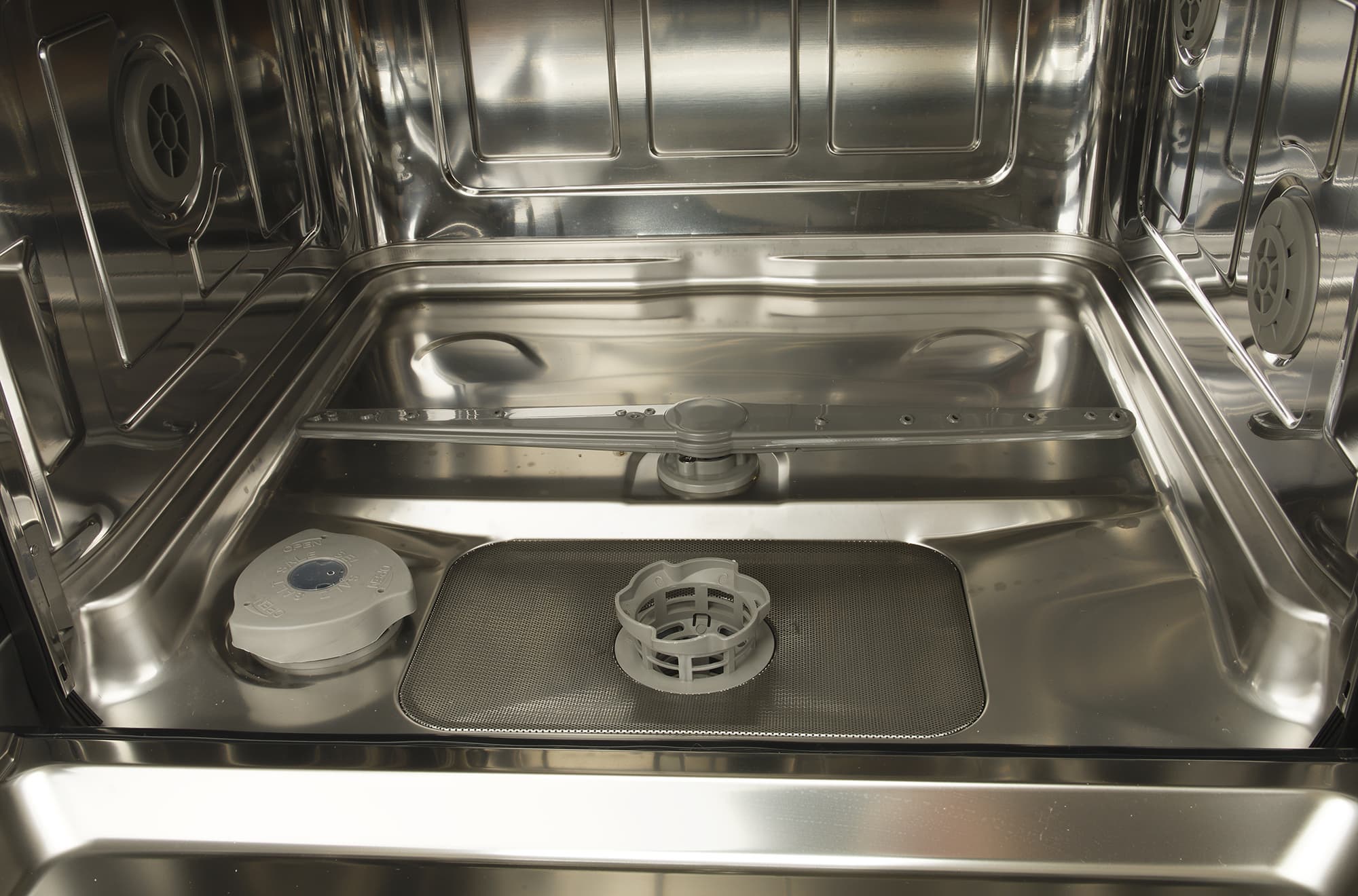 Рабочая камера устройства выполнена из нержавеющей стали. В этой модели всего один разбрызгиватель, расположен он на дне камеры. Рядом находятся съемный фильтр и отсек для соли. Вращение разбрызгивателя достигается за счет напора воды, выходящей из отверстий, ориентированных под различными углами.