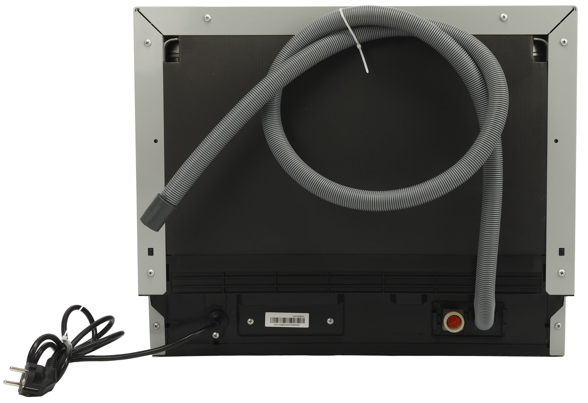 На задней стенке внизу — отверстие для подключения комплектного шланга подачи воды и несъемный сливной шланг. Рядом слева выходит шнур электропитания с вилкой.