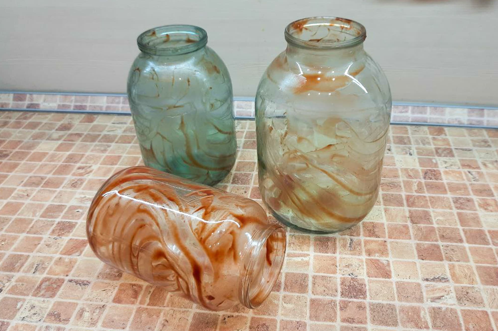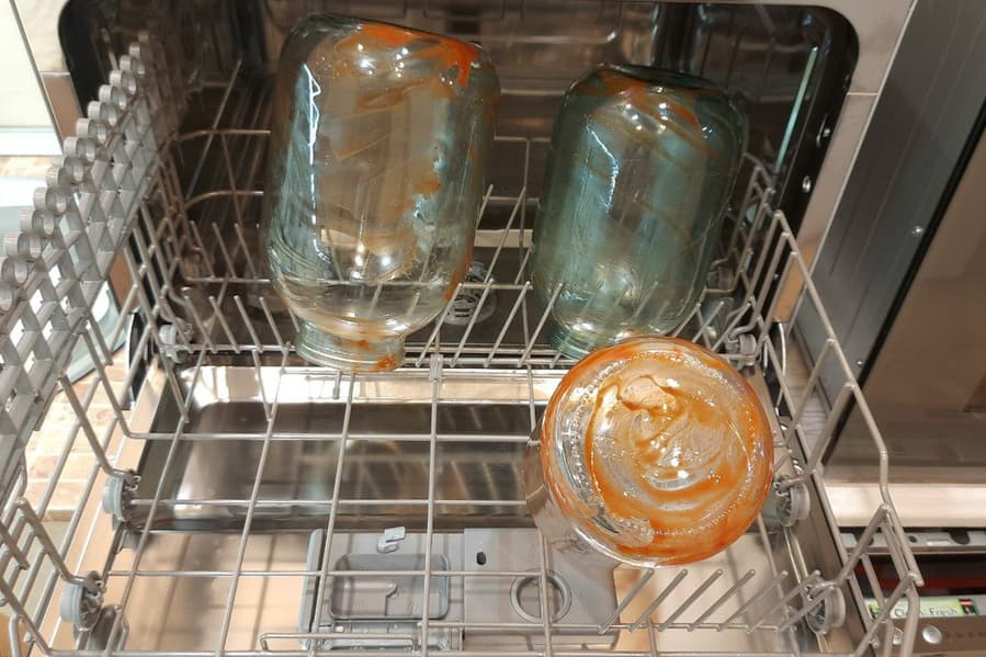 Обычно для этого теста мы выбираем программу Эко или Стандартная. Но Эко к тому моменту мы уже опробовали, а Стандартной или Универсальной в нашей посудомойке нет, зато есть Быстрая. Напомним, это ускоренный цикл мытья на 43 минуты с нагревом воды до 45 °C без сушки. Решили попробовать. До запуска машины банки были испачканы кетчупом и просушены в течение суток.