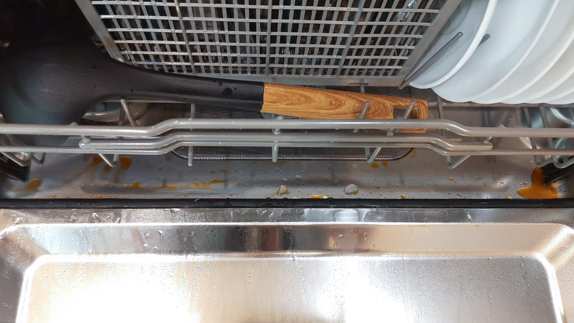 Напоследок у нас, как обычно, задание со звездочкой — керамическая форма, в которой запекалось жирное мясо в сметанном соусе. После опустошения емкости поставили ее в духовку на 15 минут в режиме Гриль и оставили на сутки подсохнуть. В обычной жизни мы бы, конечно, сначала замочили посудину на пару часов, но цель была максимально усложнить задачу и выяснить пределы возможностей устройства. Так что мы просто поместили емкость вверх дном в середину корзины и запустили посудомойку.