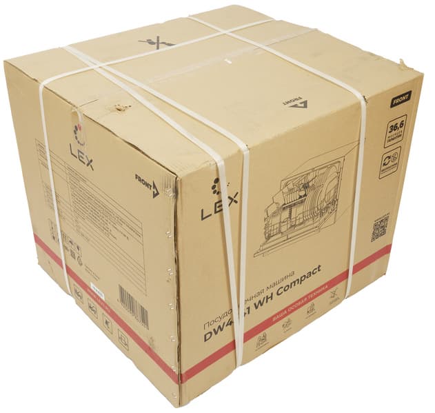 Посудомоечная машина упакована в коробку из прочного коричневого картона. На гранях упаковки размещены: логотип производителя, схематическое изображение устройства, QR-код, ведущий на официальный сайт компании, информация о гарантии, технические характеристики и транспортировочные инструкции.