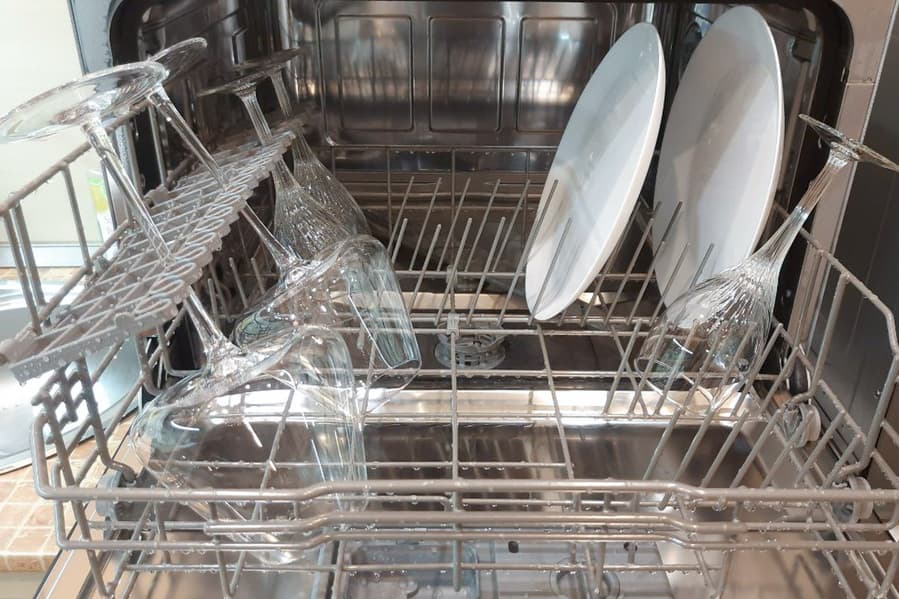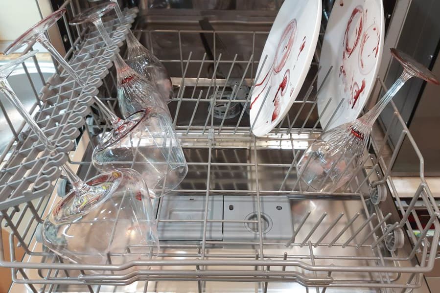 Бокалы и тарелки отмылись идеально. Следов засохшего вина или помады на посуде не осталось.