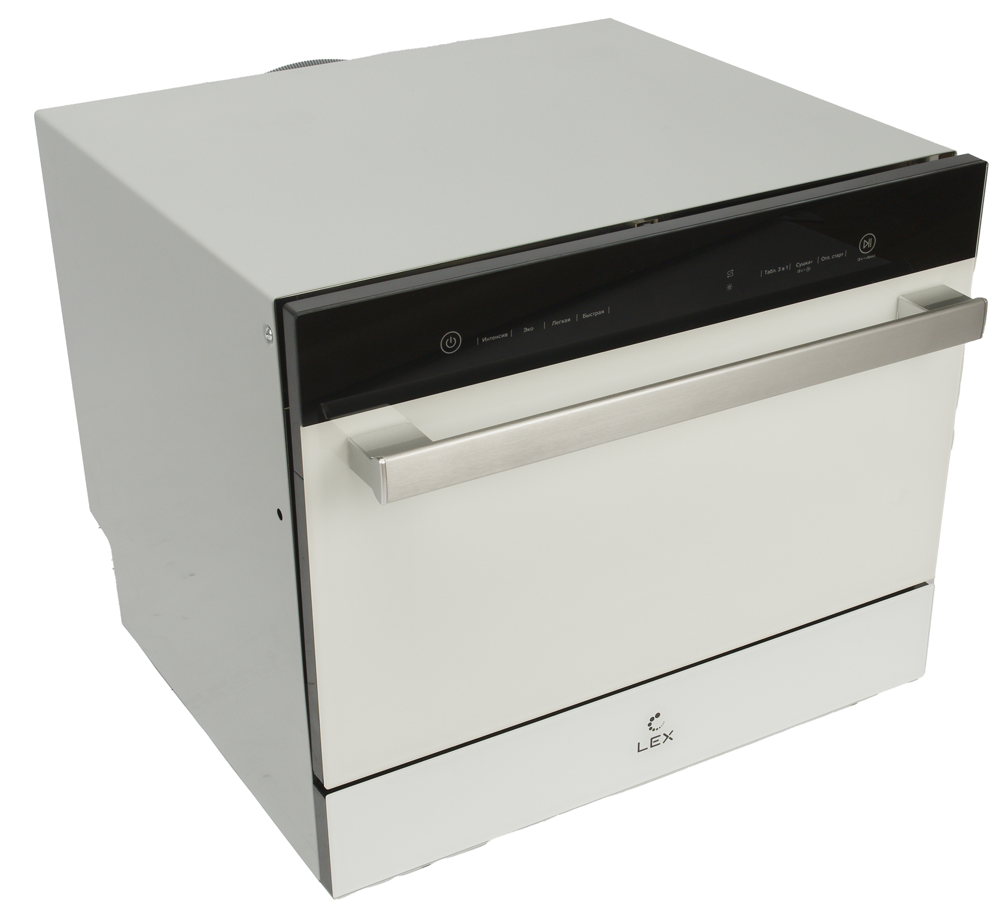 Lex DW4541 WH Compact можно устанавливать на кухонную столешницу или частично встраивать в гарнитур — красивый стеклянный фасад в таком случае остается на виду. Машина обладает небольшим набором программ, здесь их всего четыре, но по описанию похоже, что этого будет вполне достаточно для отмывания стандартных видов загрязнений. Нам предстоит выяснить, насколько удобна и эффективна эта модель, а также посчитать расход воды и электроэнергии в процессе эксплуатации.