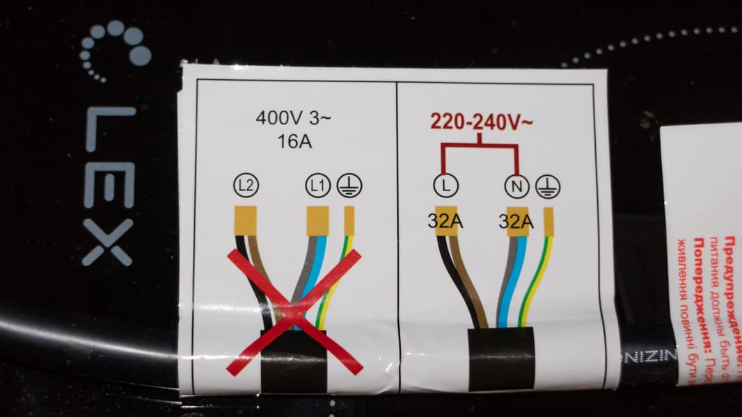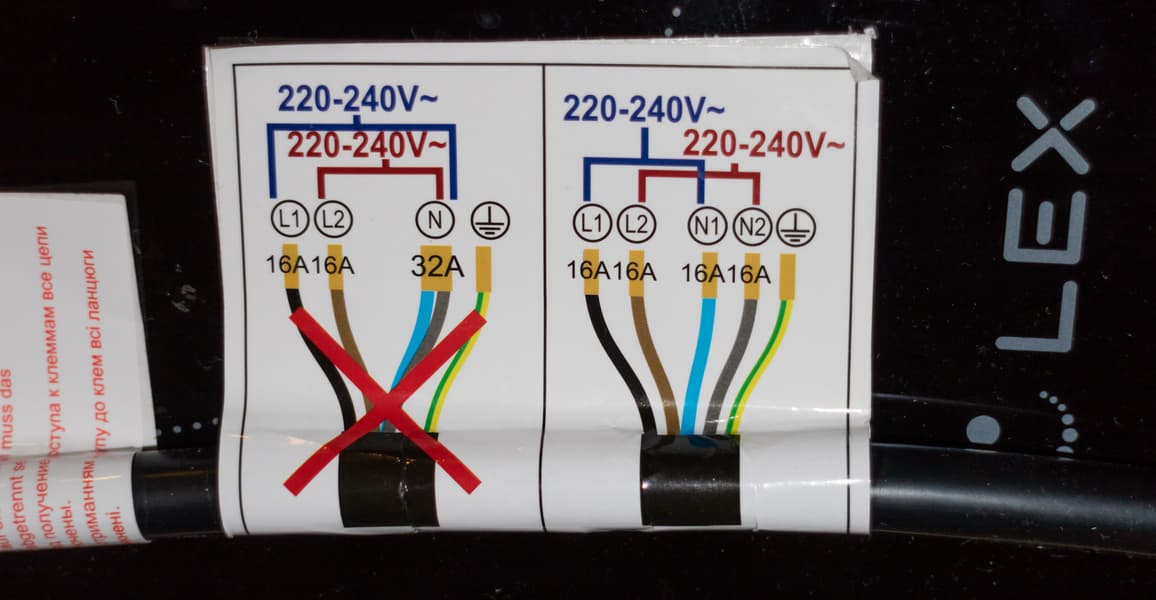 Документацией предусмотрено два способа подключения: двухфазный, при котором пары конфорок разводятся на отдельные фазы, и однофазный, когда силовые провода подключаются параллельно к одному источнику. Соответственно, в первом варианте сеть должна поддерживать ток до 16 А на фазу, во втором — 32 А. Подробные указания по подключению содержатся в инструкции, а также продублированы яркими цветными стикерами непосредственно на силовом кабеле.