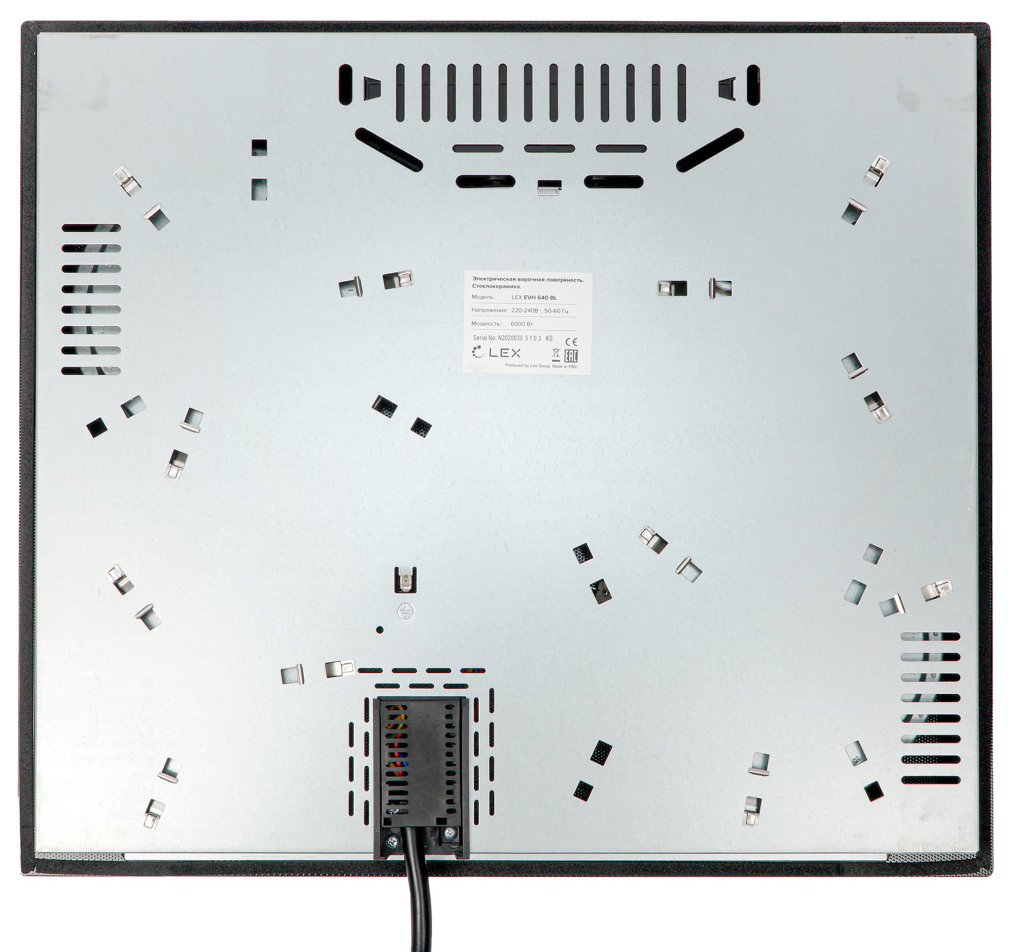С обратной стороны панель представляет собой короб из оцинкованного железа, на котором имеются: наклейка с информацией о приборе, вентиляционные и технические отверстия, а также место присоединения кабеля электропитания. В соответствии с правилами подключения высокомощных электрических приборов, кабель не укомплектован вилкой.