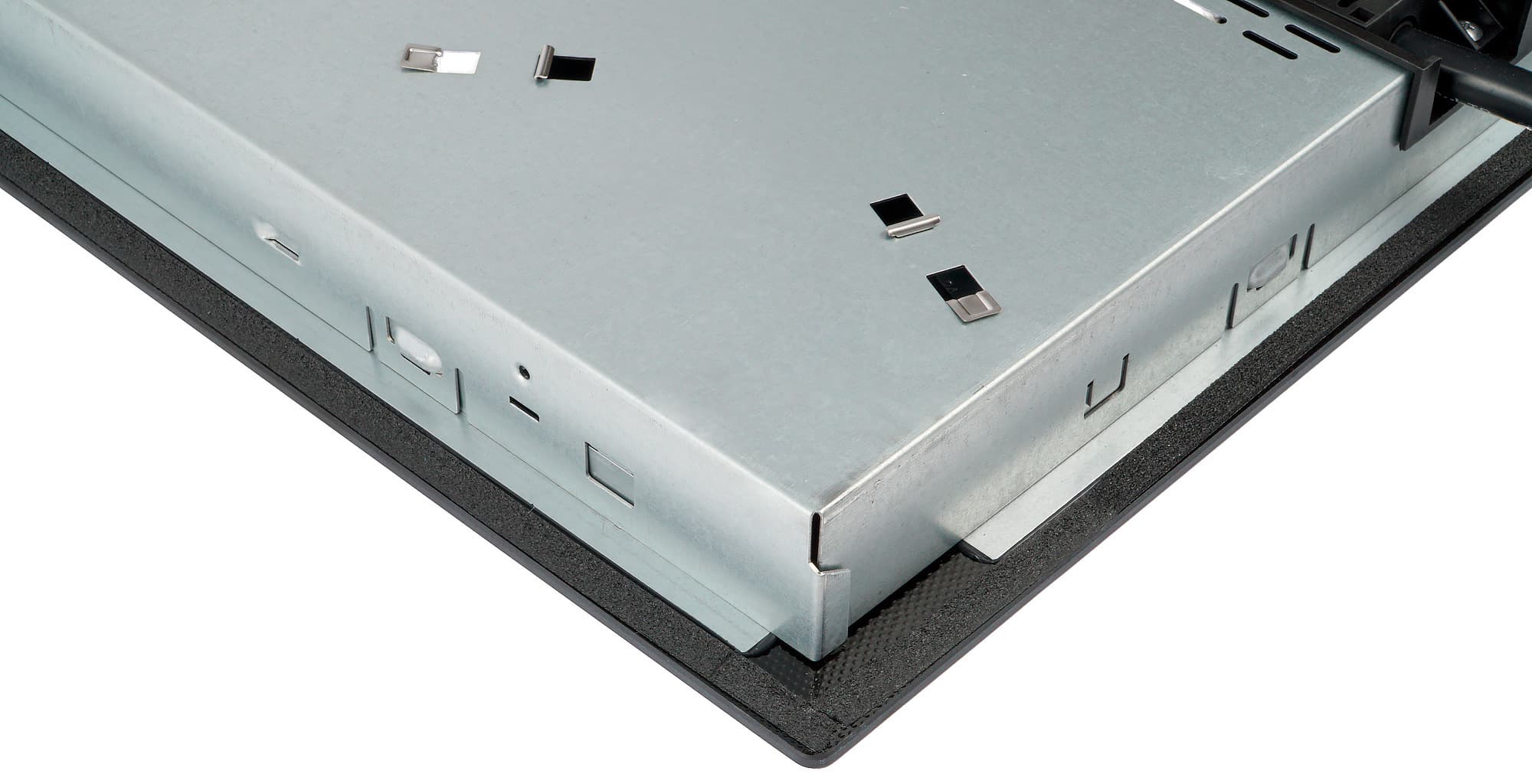 По бокам — отверстия и пазы для размещения крепежных скоб. С обратной поверхности стеклокерамической панели по периметру проложен сантиметровый слой уплотнителя.