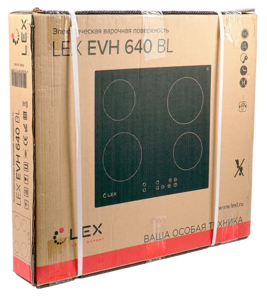 В выключенном состоянии варочная панель Lex EVH 640, подключенная к сети, потребляет 0,4 Вт. Включенная панель с неработающими конфорками — 1,0 Вт.
