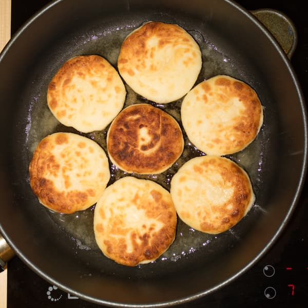 Для жарки сырников использовали сковороду с диаметром дна 22 см. Разместили ее на большой конфорке. Налили растительное масло и включили максимальный режим нагрева. Через 2 минуты 40 секунд масло раскалилось достаточно, чтобы выложить сырники. Буквально через минуту стало понятно, что нагрев надо бы уменьшить. Всю оставшуюся часть теста конфорка работала в оказавшимся оптимальным для этой цели седьмом режиме.