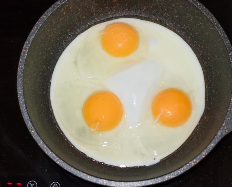 Самый простой, но, возможно, не самый бесполезный тест, позволяющий оценить нам скорость и равномерность рабочей зоны. На максимальном режиме конфорки малого диаметра немного подогрели сковороду диаметром 15 см с маслом, затем вбили три яйца, которые равномерно растеклись по дну.