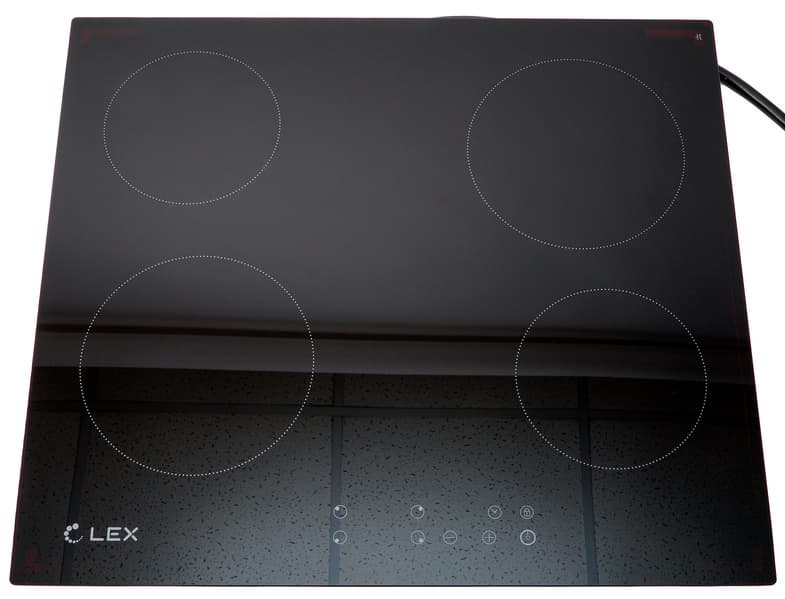 Практически все стеклокерамические варочные панели выглядят одинаково, отличаясь, чаще всего, панелью управления и формой/размером конфорок. Не стала исключением и героиня нашего обзора. Размер Lex EVH 640 — стандартный под встраивание в 60-сантиметровый шкаф. Поверхность прибора изготовлена из затемненного стекла, зоны нагрева обозначены окружностями, сенсорные кнопки снабжены пиктограммами.
