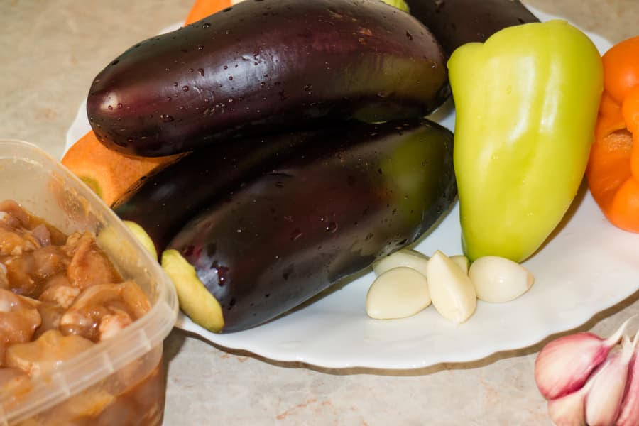 В закромах у нас нашлись самые что ни на есть простые сезонные овощи и корнеплоды: лук, морковь, баклажаны и болгарский перец. Тщательно вымыли, что необходимо, очистили и также нарезали соломкой.