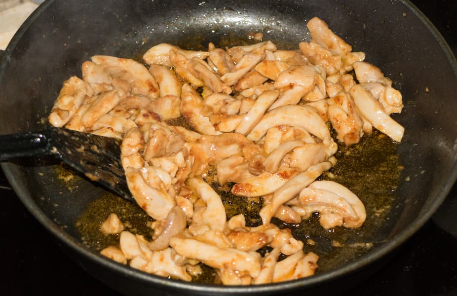 Хорошенько раскалили сковороду с маслом, затем закинули туда курицу. Кусочки распределились по дну в один слой — именно то, что надо для быстрой обжарки. Температура масла была достаточно велика, нагрев поддерживался на нужном уровне, так что кусочки «запечатывались», выделяющийся же сок мгновенно испарялся. Буквально минуты через три филе было обжарено.