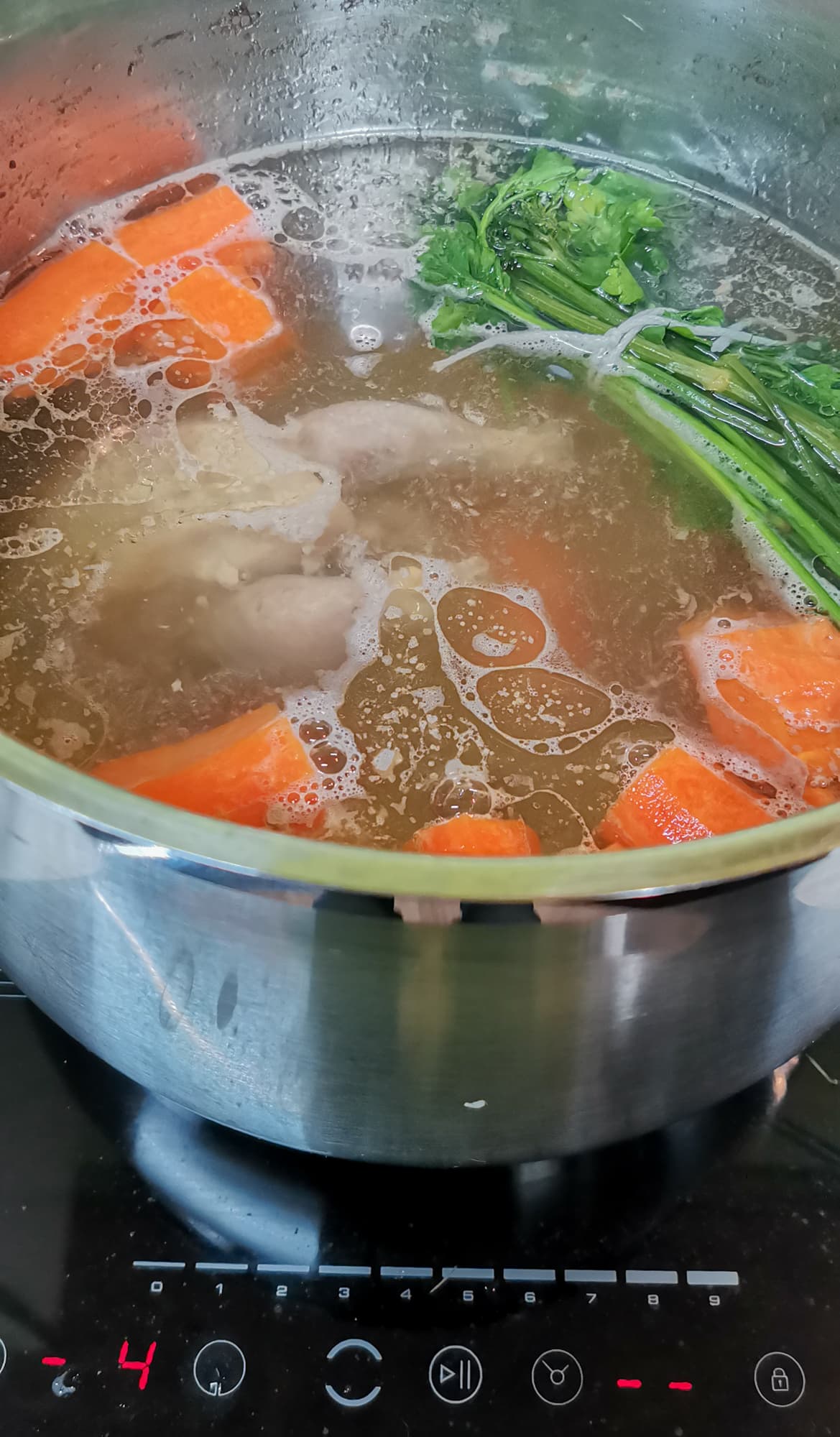 В кастрюлю на 6,5 л положили несколько куриц-корнишонов, залили водой и поставили на плиту в режиме слабого нагрева. Выставили таймер на 1,5 часа. Через 1,5 часа добавили в бульон морковь, корни петрушки и зелень.