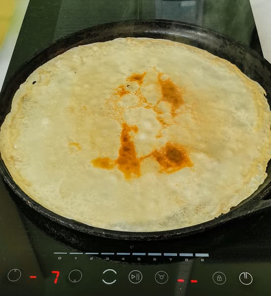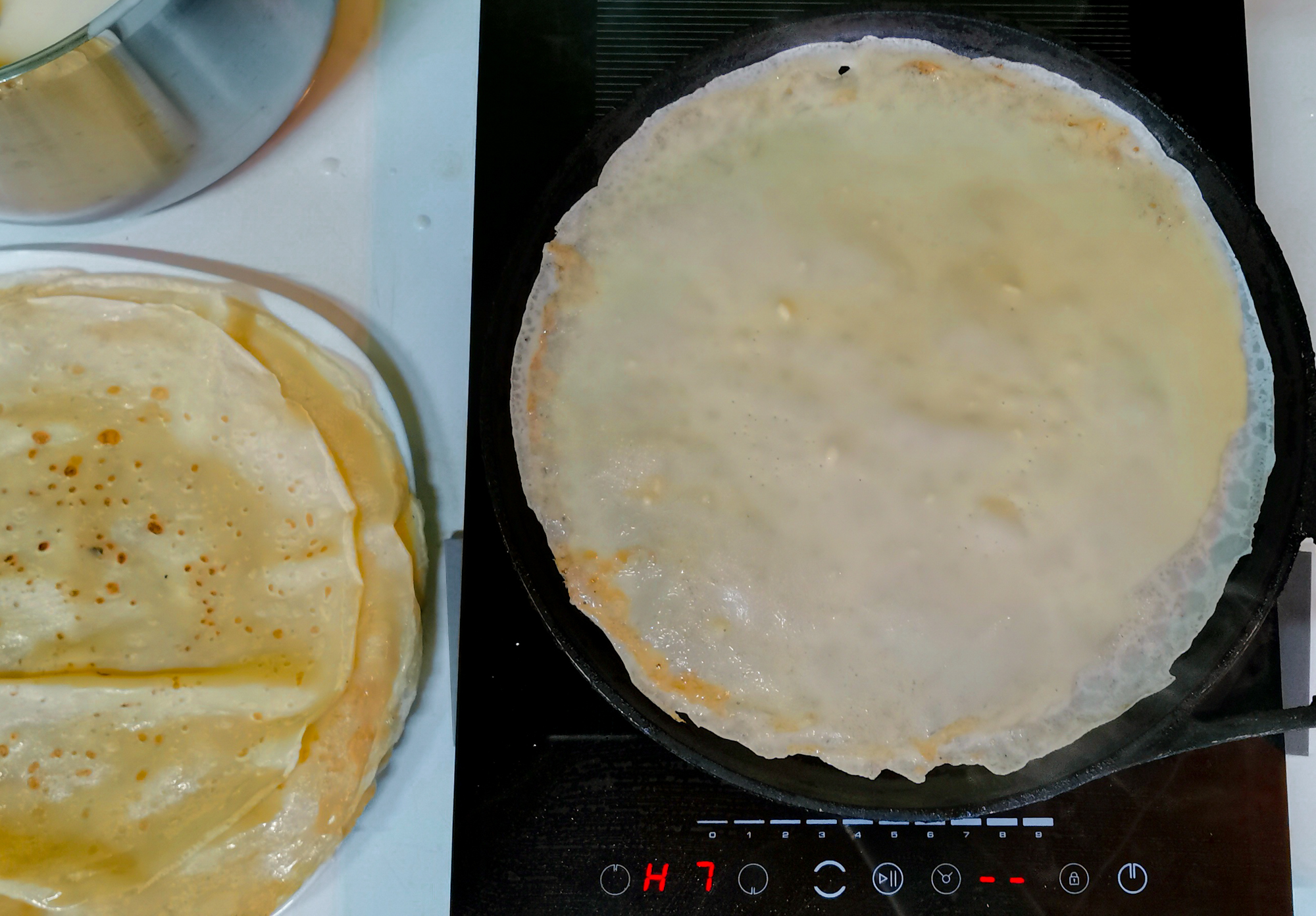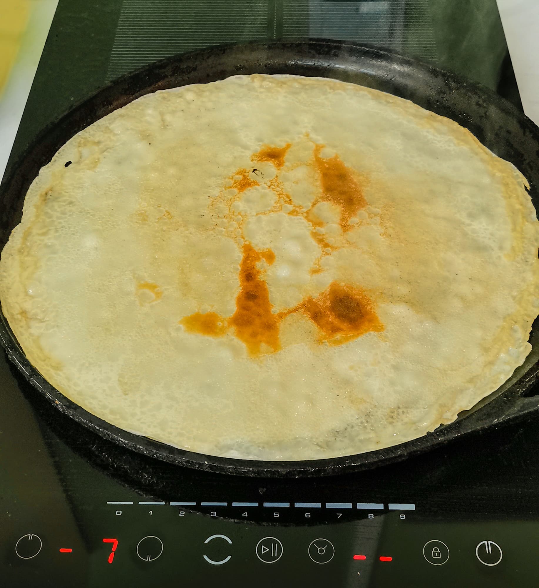 Мы сделали стандартное блинное тесто, взяли чугунную сковородку диаметром 32 см. После некоторых проб оказалось, что оптимальная мощность для тонких блинов в нашем случае — 7.