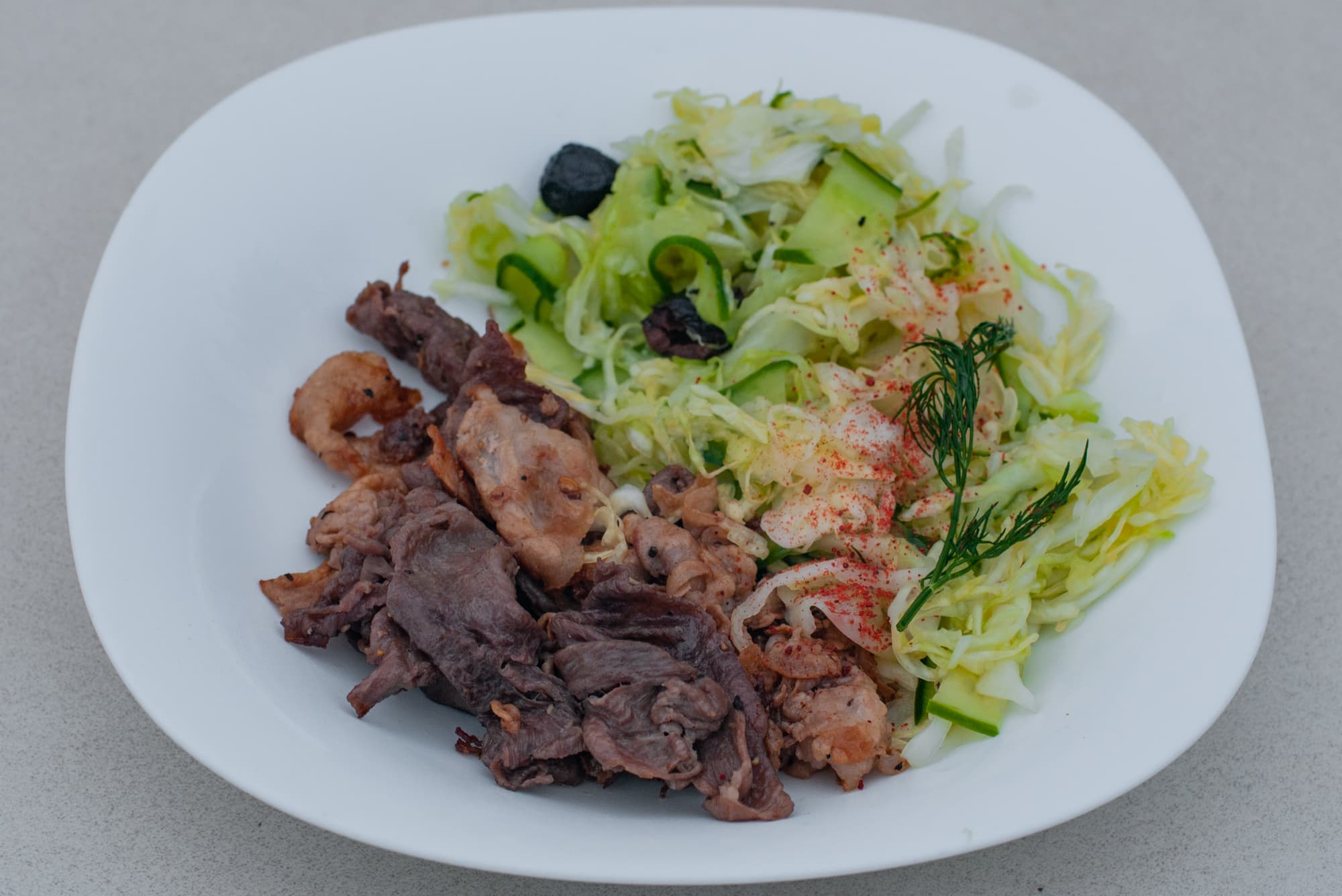 Мясо обжарилось практически моментально, даже не успев дать сок. В результате достаточно жилистая говядина оказалась мягкой, но при этом сочной. Подали с салатом из капусты, огурца и оливок.