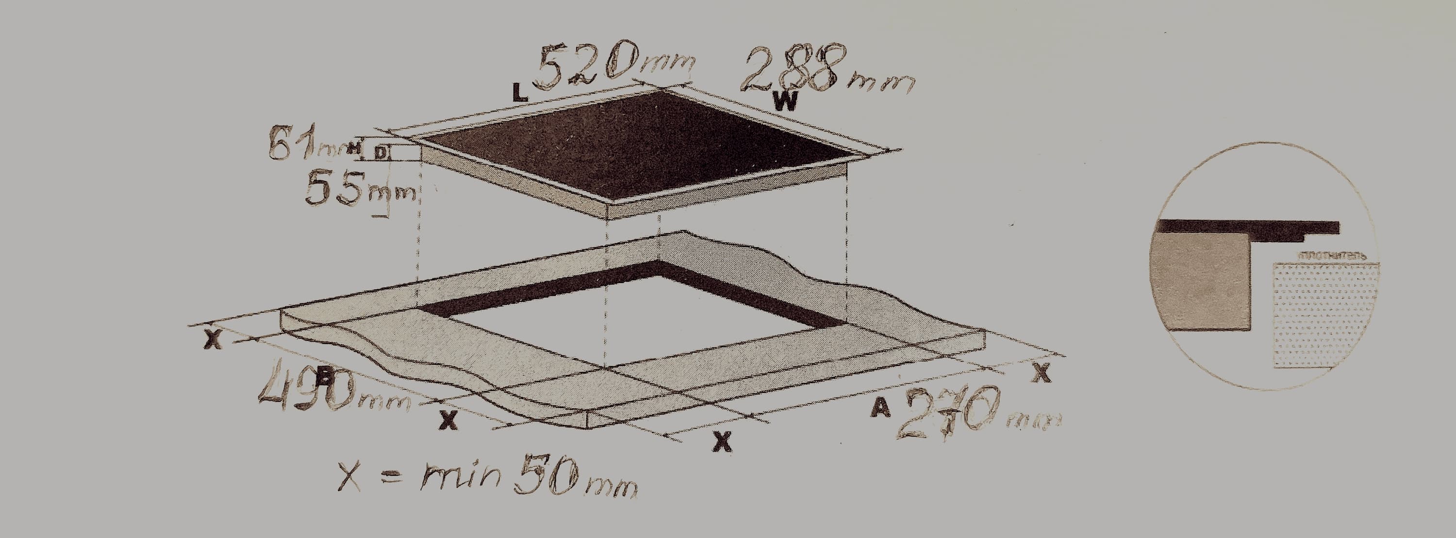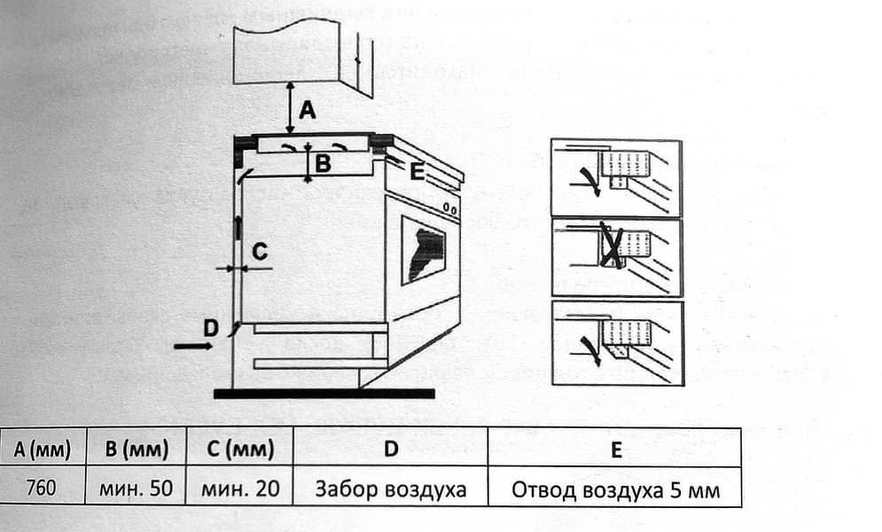 Столешница для врезки должна быть из термостойкого материала не менее 20 мм толщиной.