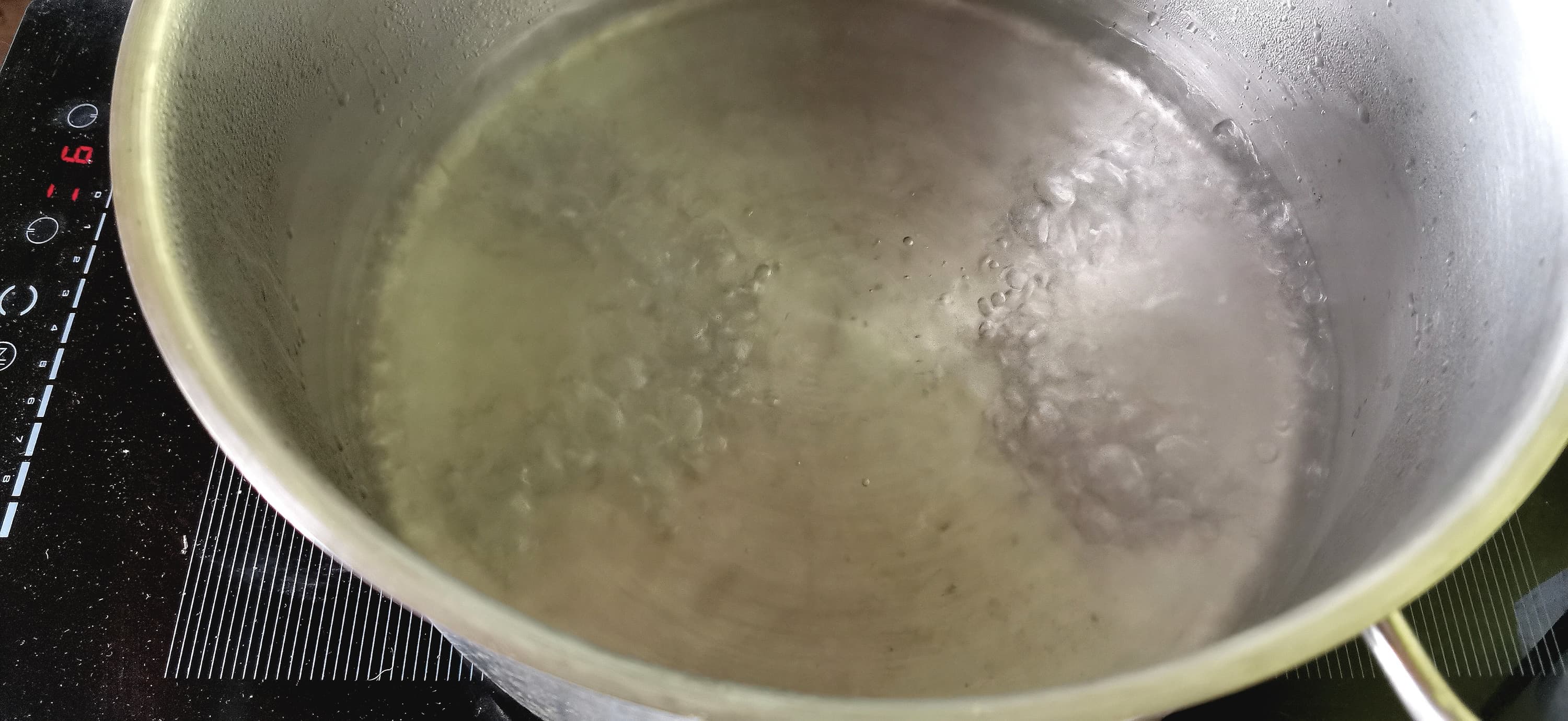 В зоне FlexZone (середина плиты, две конфорки одновременно) в той же стальной кастрюле 1 литр воды температурой 20 °C дошел до фазы активных пузырьков за 1 минуту 20 секунд, вскипел за 2 минуты 30 секунд. Плитка работала в режиме регулировки мощности на максимум (9, 3200-3500 Вт), максимальное энергопотребление составило 3450 Вт. На кипячение было потрачено 0,137 кВт·ч электроэнергии (с учетом нагревания большой кастрюли).