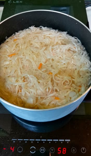 Уложили сверху квашеную капусту со специями, долили воды, выставили мощность и таймер. Тушили на режиме 4 в течение 2 часов.