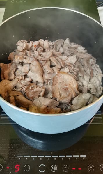 Мы взяли говядину и свинину, нарезали тонкими кусочками и обжарили на максимальной мощности в режиме совмещения конфорок FlexZone на сковороде 30 см диаметром.