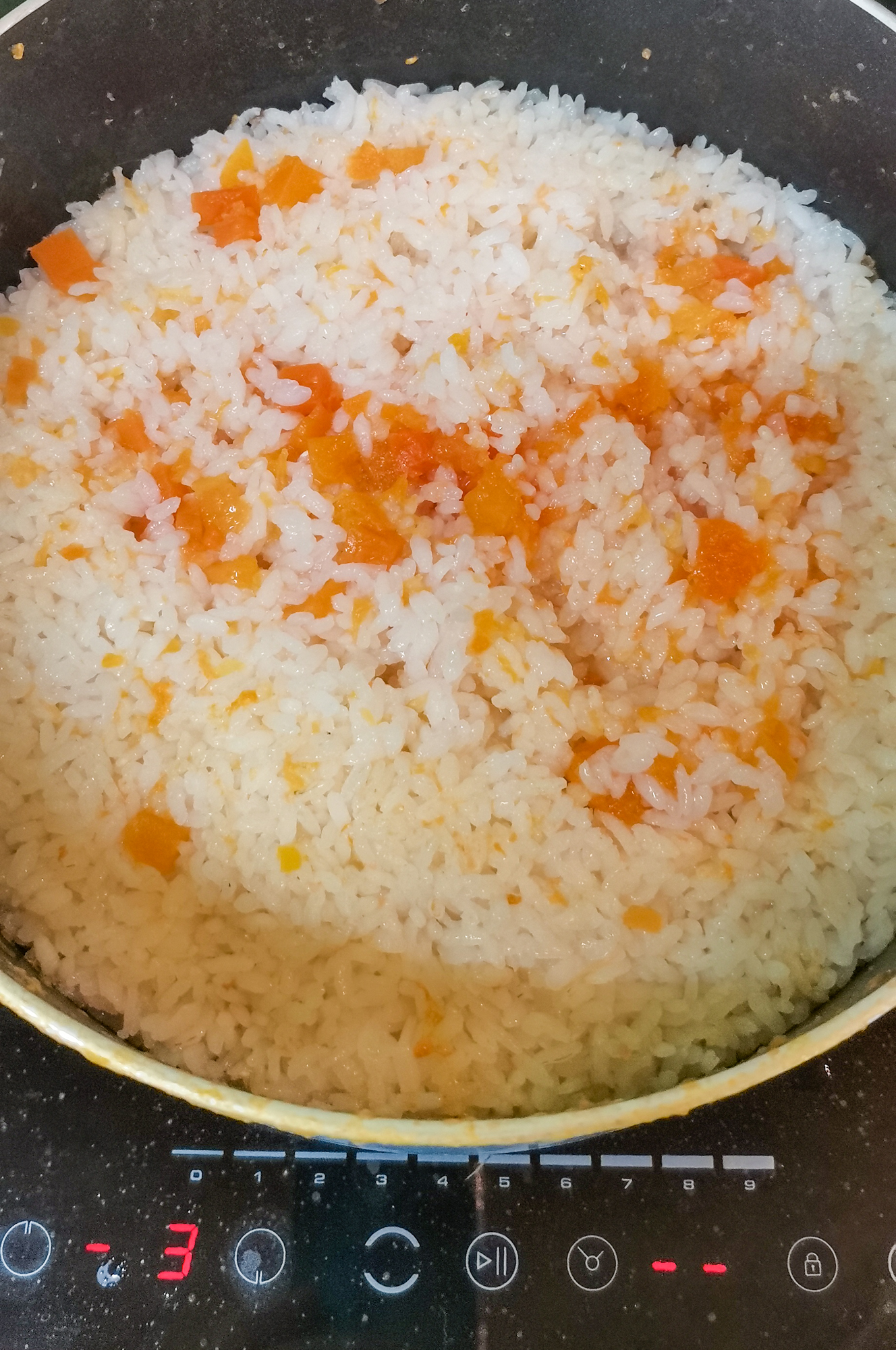 Готовили в 5-литровой кастрюле на режиме 3. В кастрюлю засыпали тыкву, долили воды, посолили, всыпали сверху рис. Закрыли крышкой, выставили мощность и таймер и забыли про кашу на 1,5 часа.