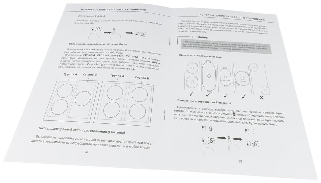 Если снять с конфорки посуду и забыть ее выключить, панель моментально прекратит нагрев и автоматически выключится через 2 минуты.
