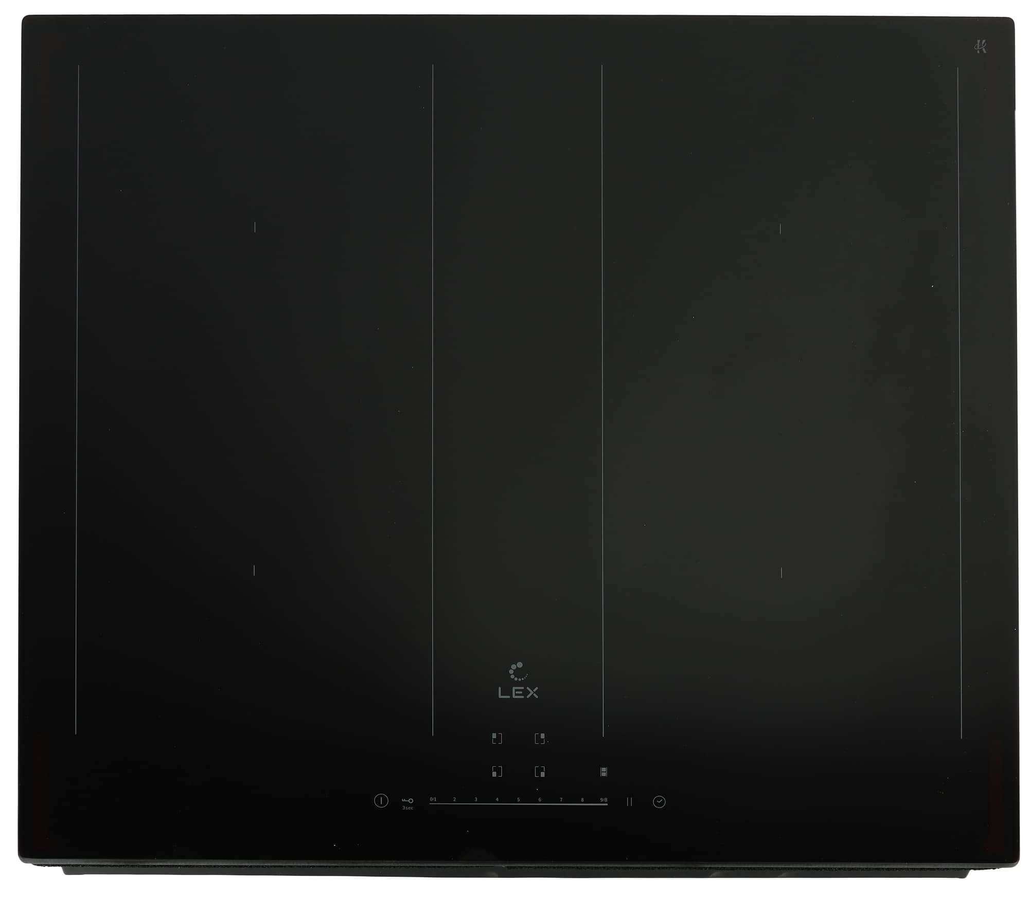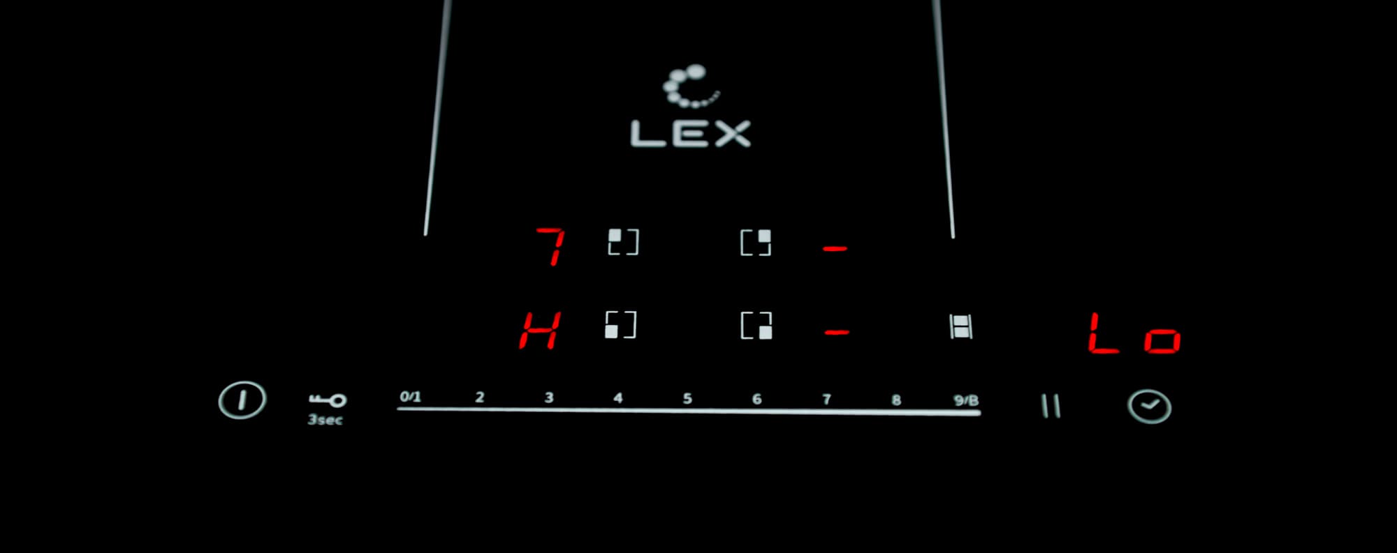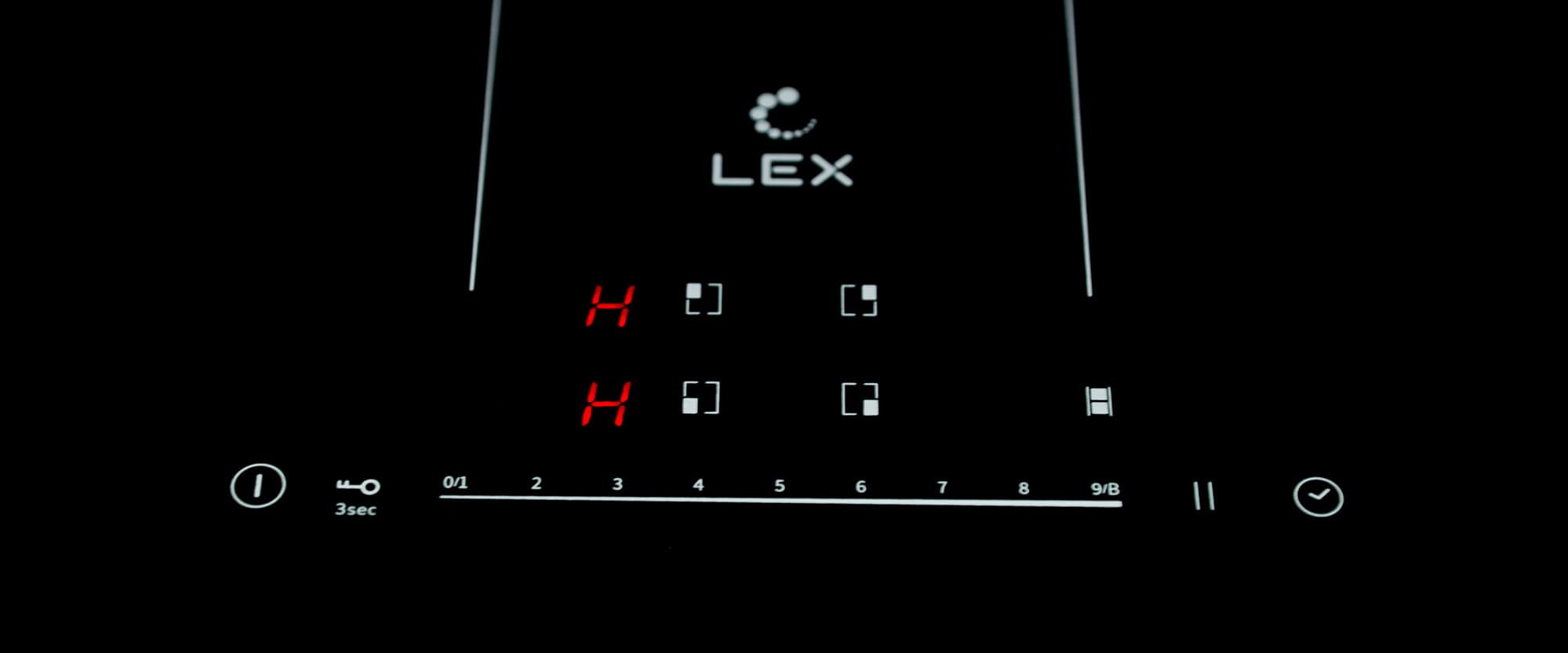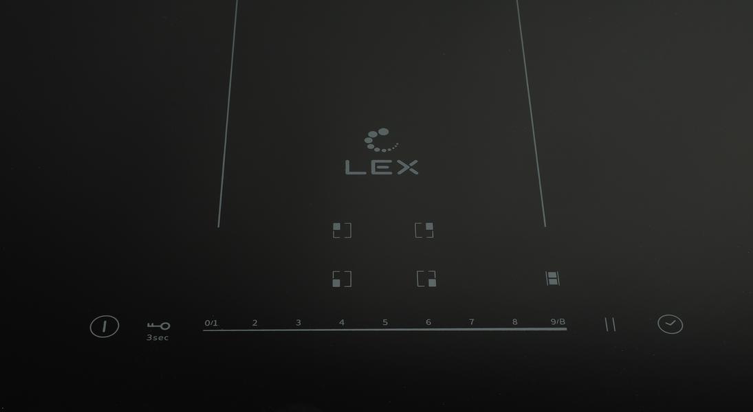 Сенсорная панель управления Lex EVI 641B BL условно делится на две части. По центру нижнего ряда располагается 9-ступенчатый слайдер для управления мощностью. Кнопки по бокам от него отвечают за: включение и выключение панели, блокировку, паузу и таймер.