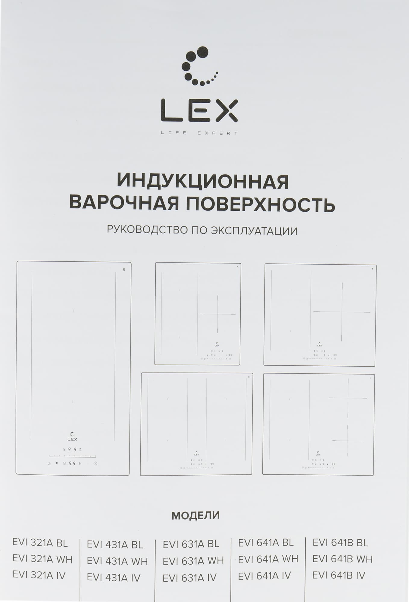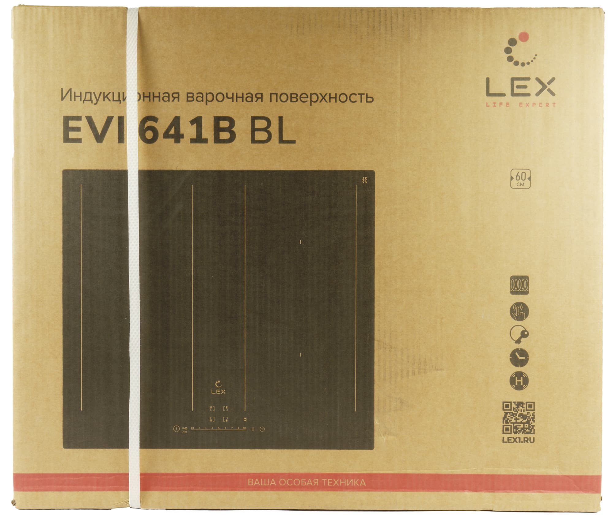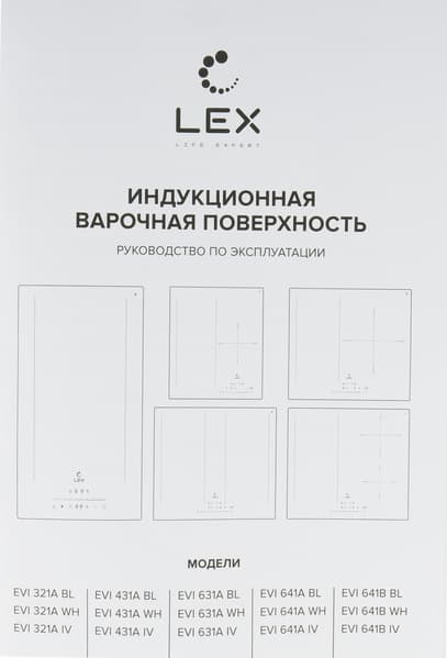 Варочная панель Lex EVI 641B BL поставляется в большой плоской коробке из прочного картона. На лицевой и обратной сторонах коробки размещены: изображение устройства, полное название модели, логотип компании, перечислены ключевые особенности и краткие технические характеристики.