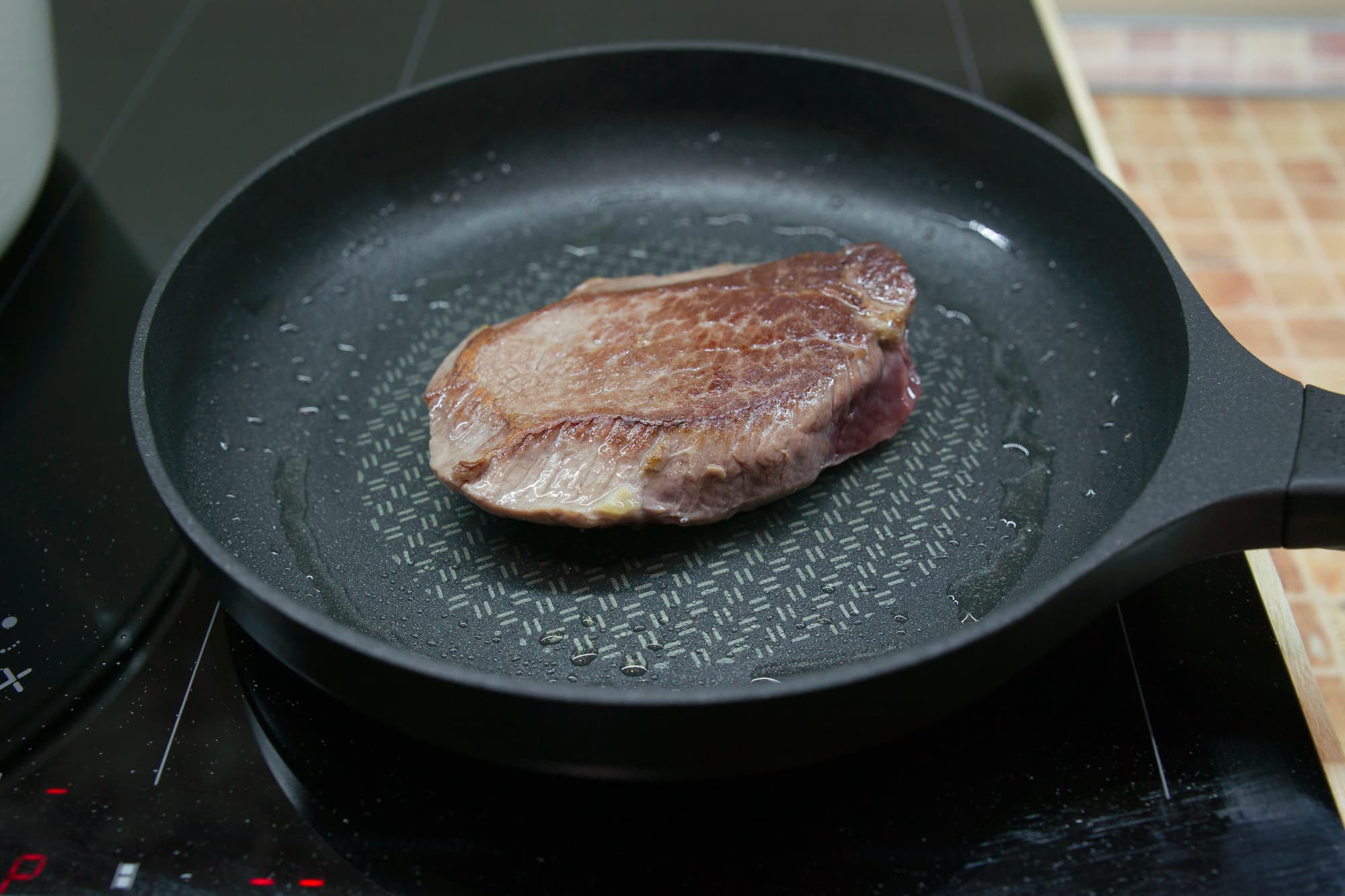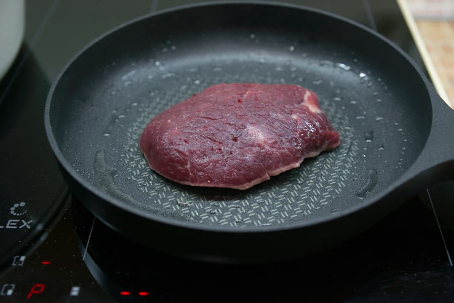 На раскаленную сковородку выложили кусок говядины комнатной температуры, смазанный растительным маслом, обжарили его по минуте с каждой стороны в режиме Boost, а затем еще несколько минут, переворачивая, уже на 9-м уровне.